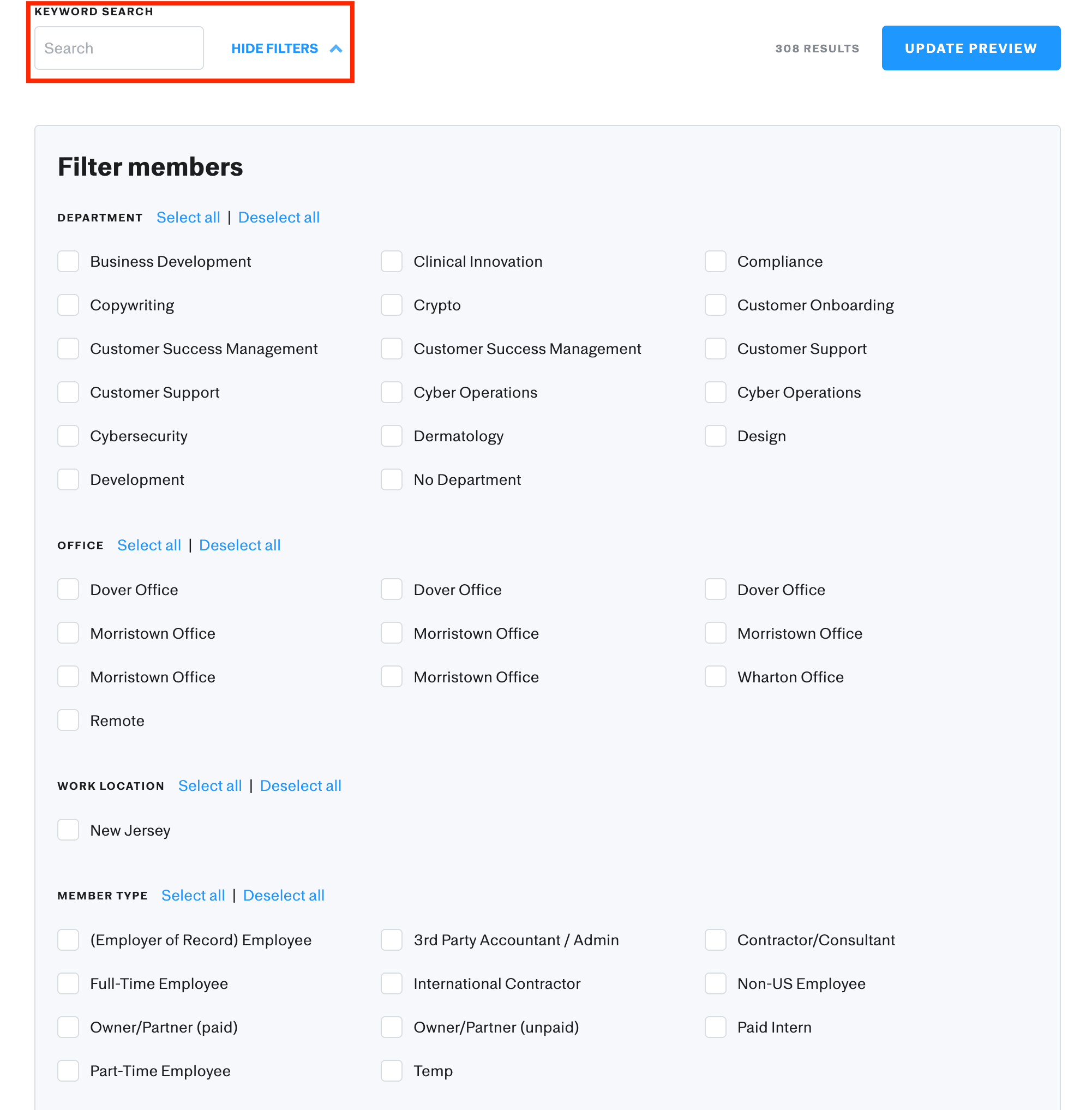 You can also search by keyword, which is especially helpful when trying to look for information that might not be covered by the above filters, such as a specific role.