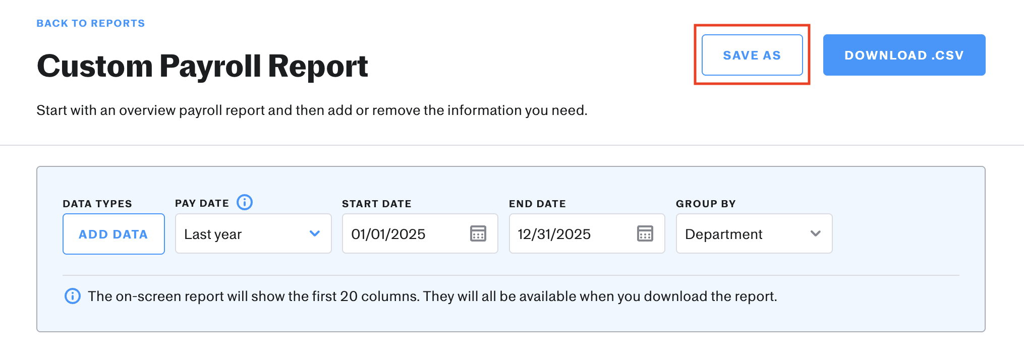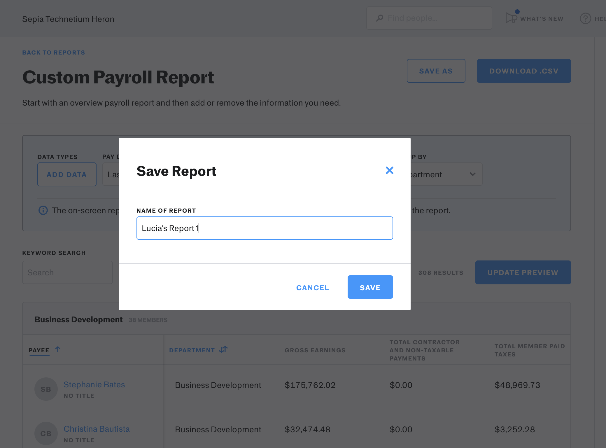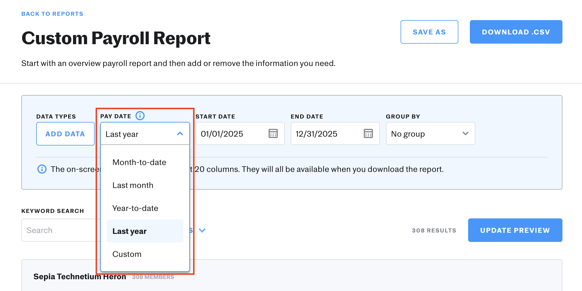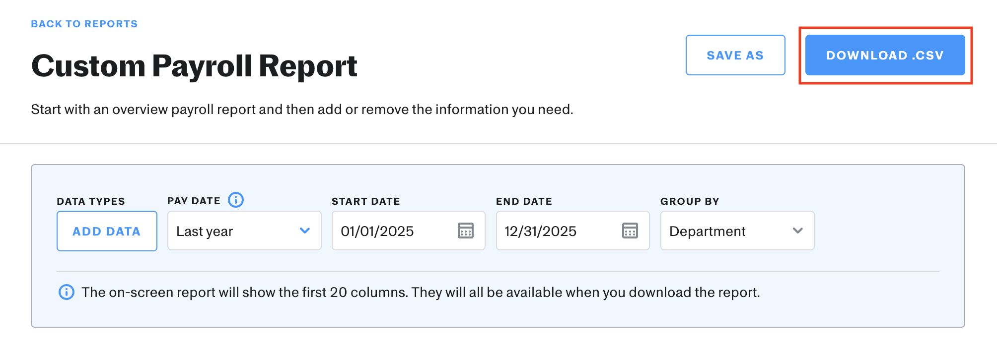 Screenshot showing Download .CSV button in the Custom Payroll Report.