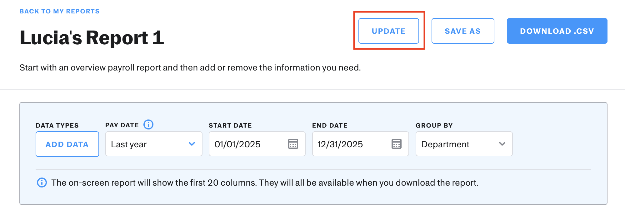 You can also update your saved report template by clicking the report name and after making any necessary changes, clicking “Update” in the upper right hand corner.