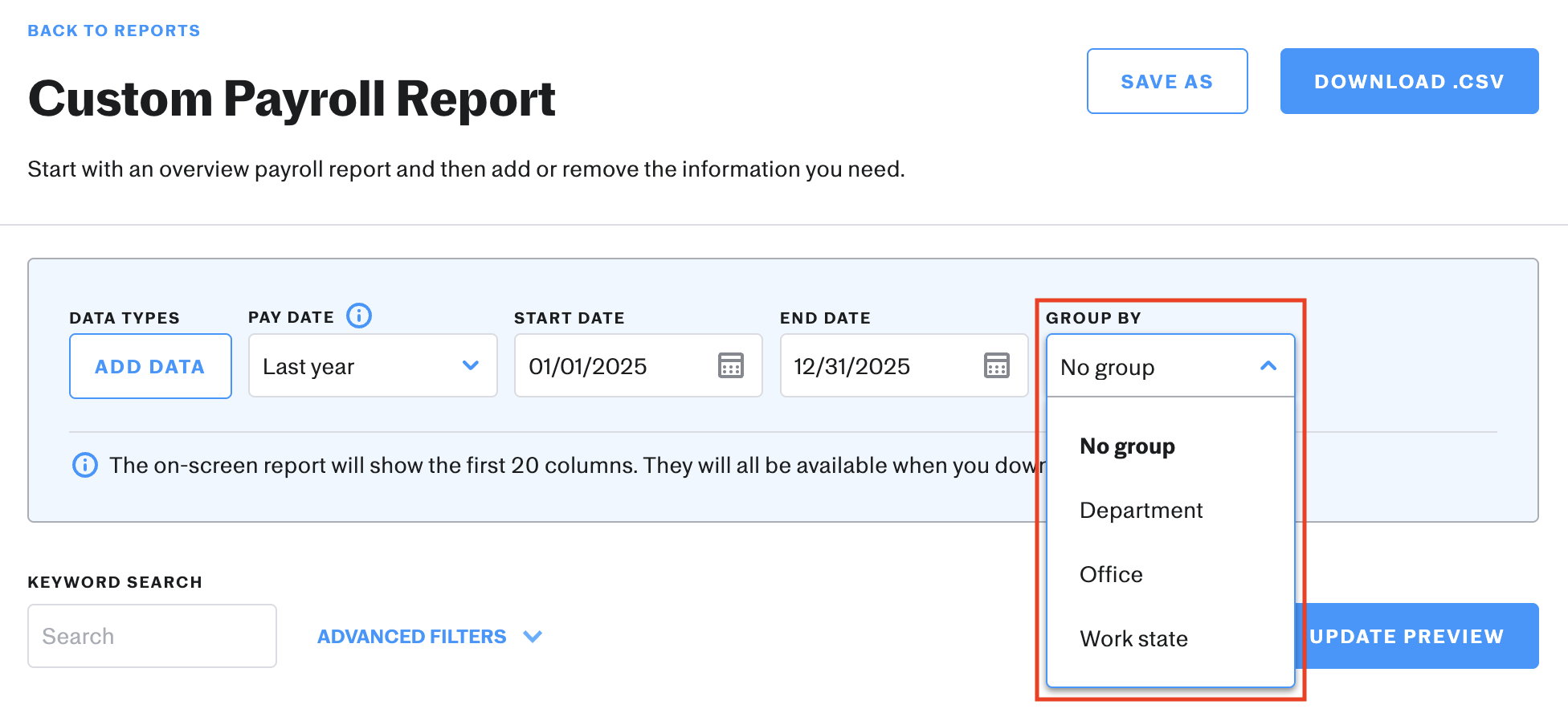 There may be cases where you need to see totals broken out by particular groupings. With the Custom Payroll Report, you are able to group by department, office or work state.