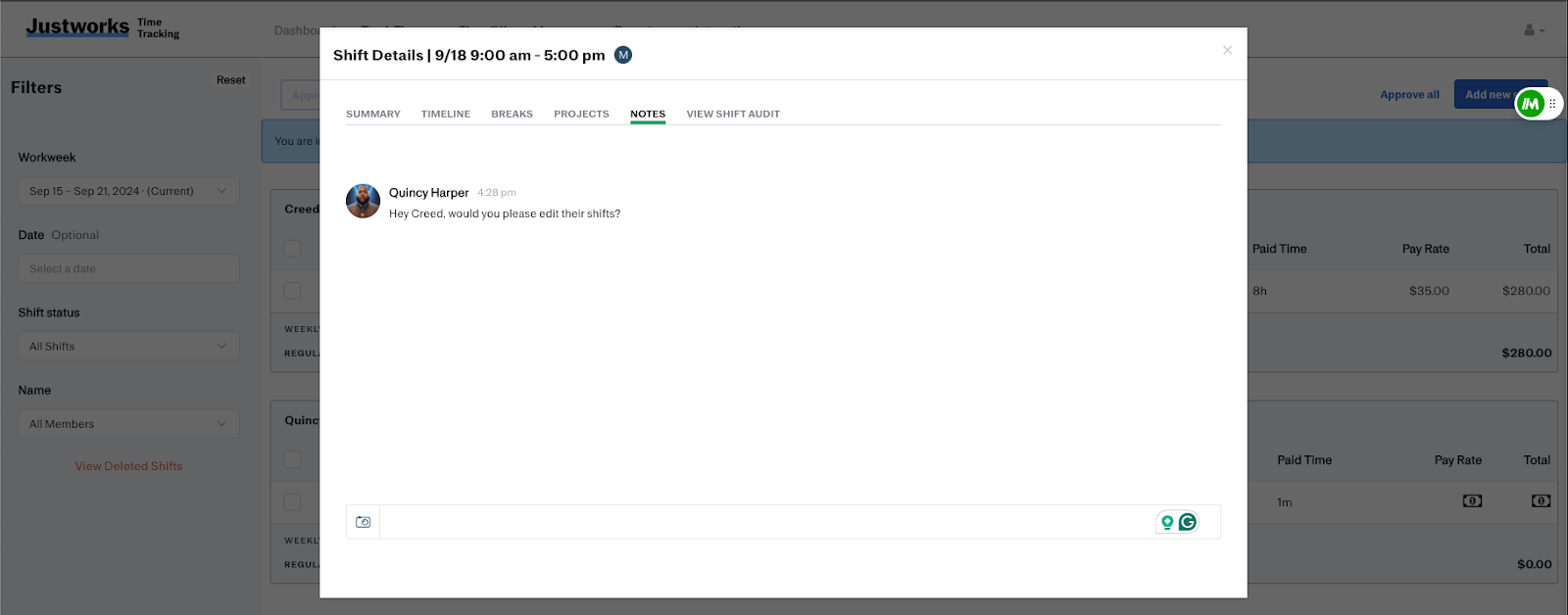 Justworks Time Tracking's notes feature allows you to enter additional information relevant to your shift. This information is stored as part of the shift record and communicated back to your supervisor or admin in real time. Your supervisor or admin can even read your Notes and reply. You'll receive a notification in the Justworks Time Tracking app when someone replies to your message.
