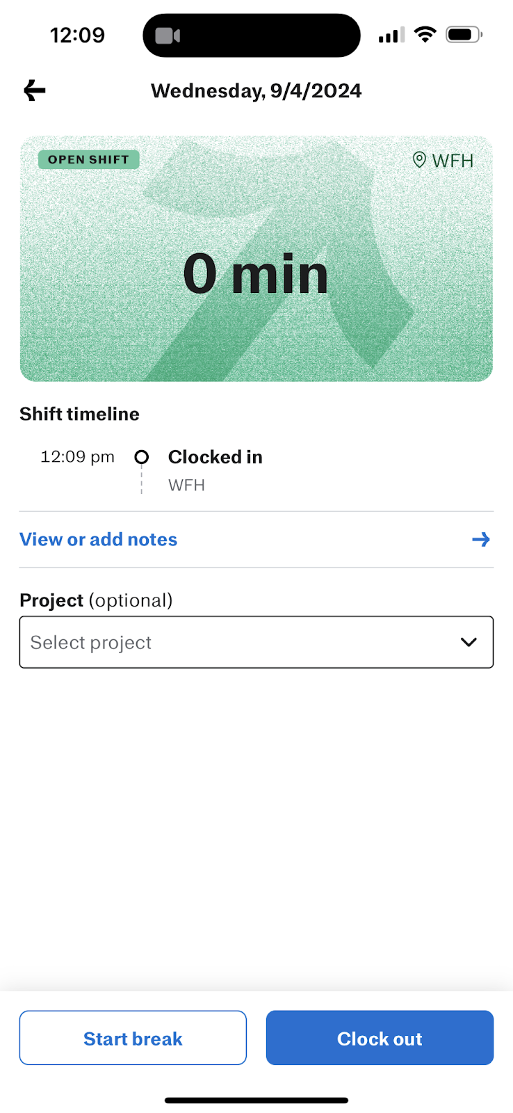 Once you're checked in to work, Justworks Time Tracking allows you to add time to specific tasks or projects from the shift details section. To do so, tap on 'Select Project'.