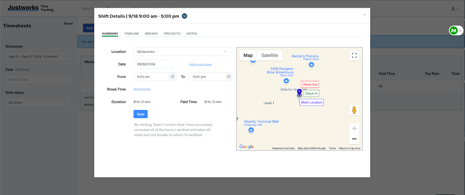 You can also add time to projects from the Justworks Time Tracking website. You can do this either in a live shift or on a shift that you've added previously.