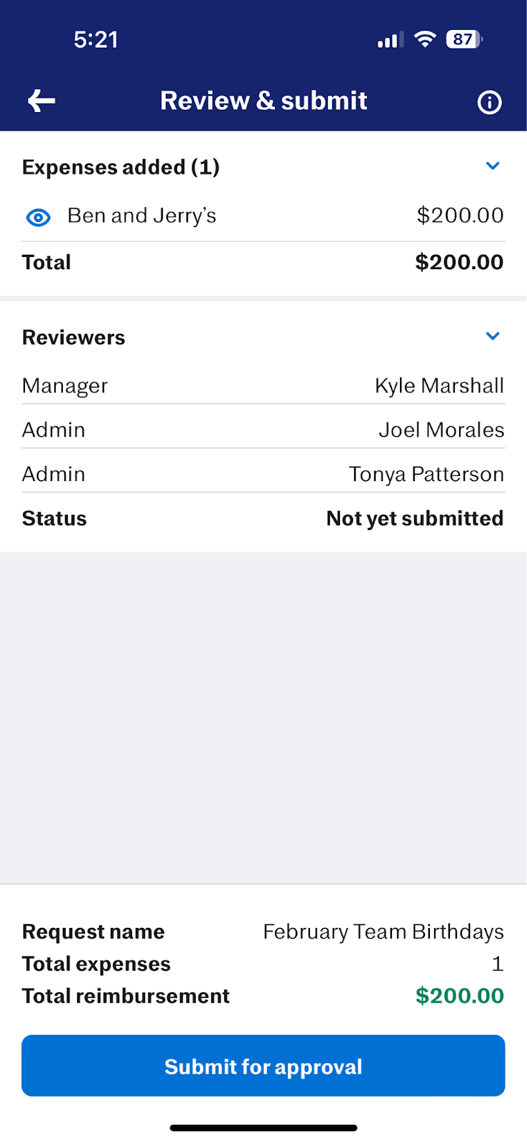 Once it’s approved, you can tap on the reimbursement request to check the estimated pay date.