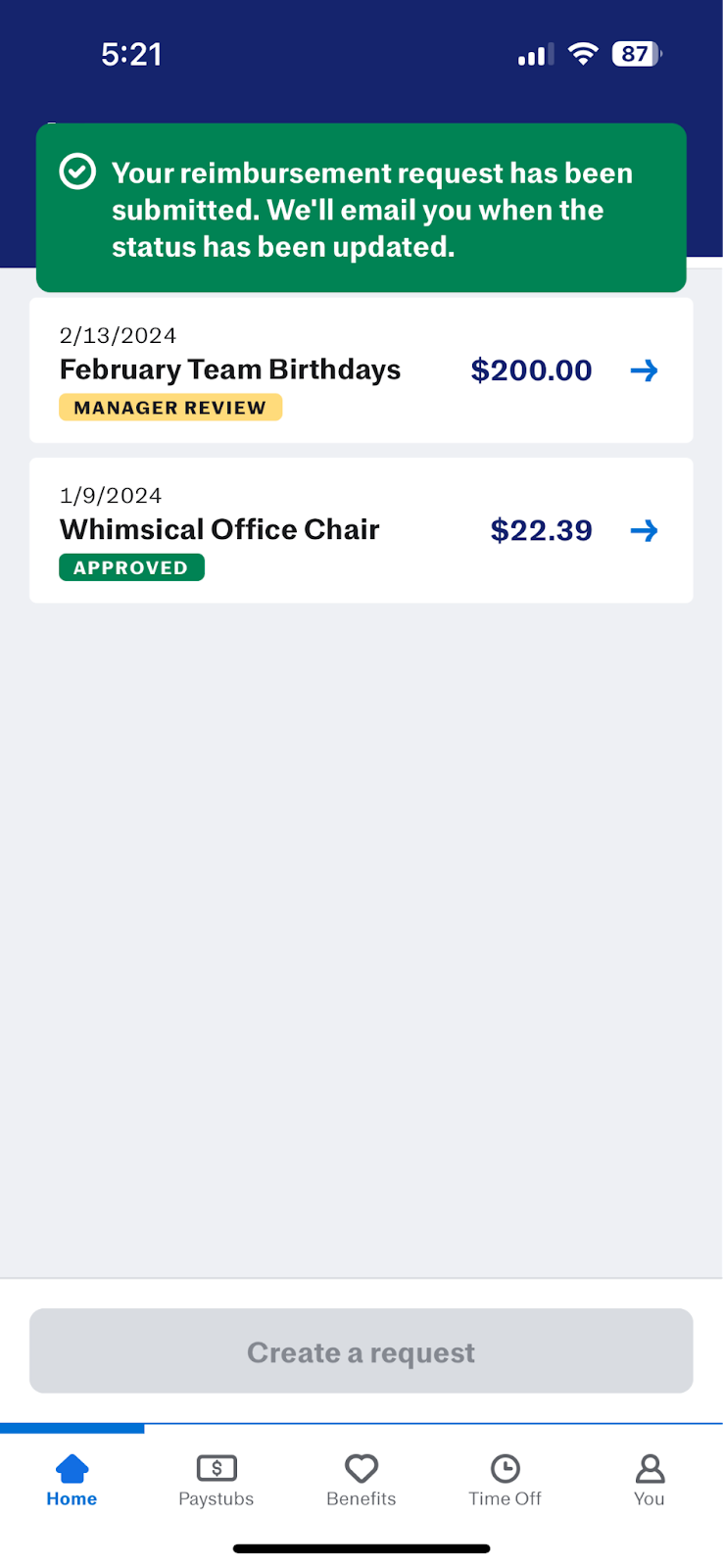 Once you successfully submit your reimbursement request, you can check its status in the app as it moves through the approval process (i.e., manager/admin review, approved, or returned). We’ll also email you when the status of your reimbursement request has been updated.