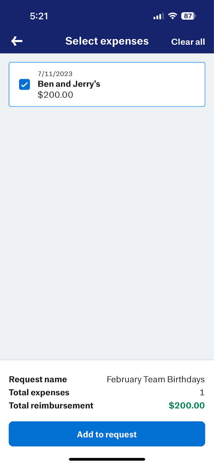- You can either select expenses individually and tap Add to request or clear all selections by tapping Clear all in the top right corner of the screen.