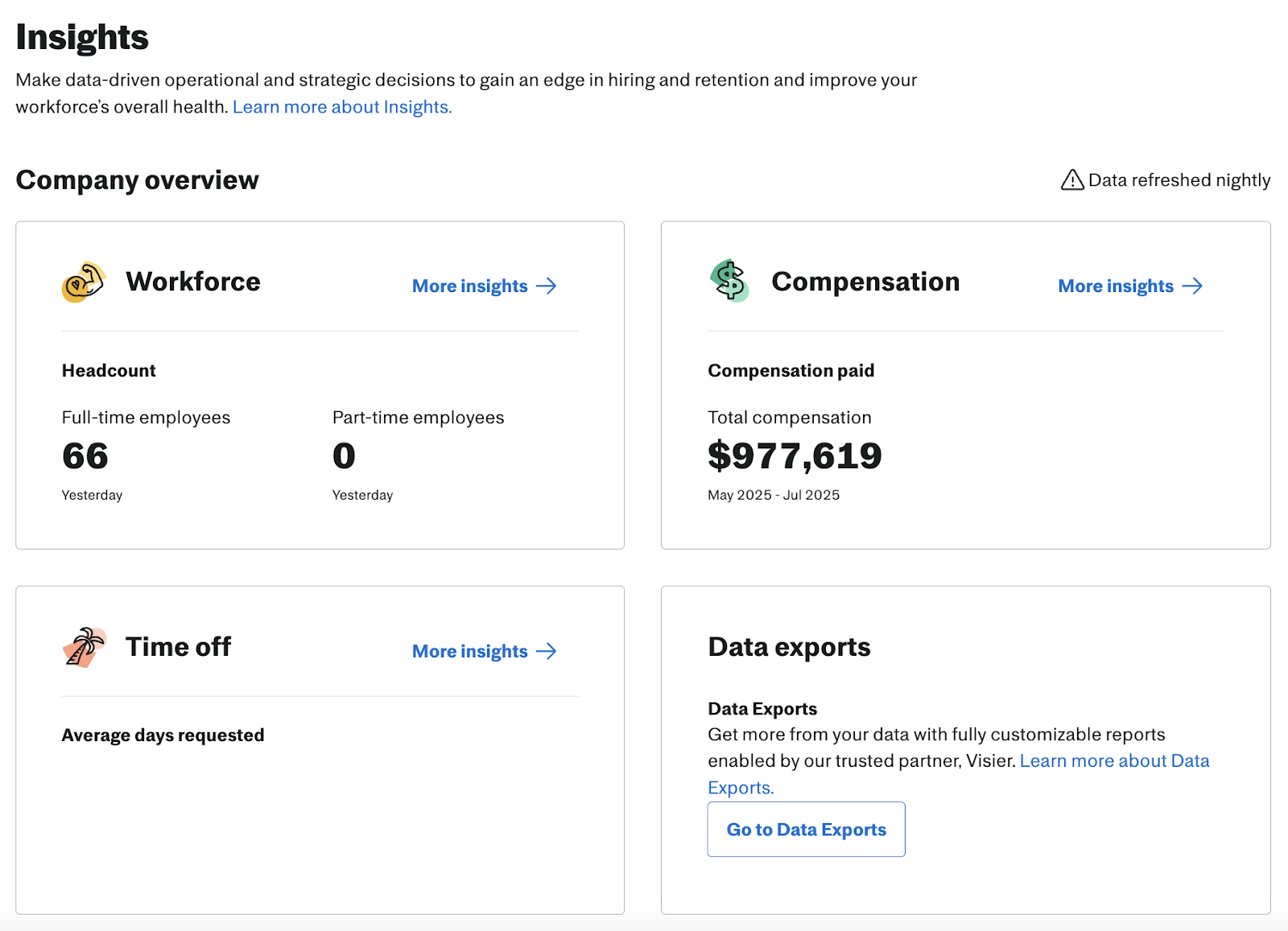 To learn more about these two tools, visit our Help Center articles on People Analytics: Data Exports and People Analytics: Insights.