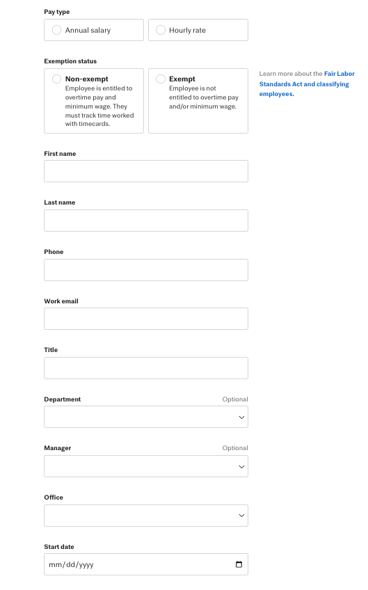Once all of the new member’s information has been filled out, you will see invite options listed at the bottom of the page. This will allow you to choose when the new member should receive their invitation link to join Justworks Payroll.