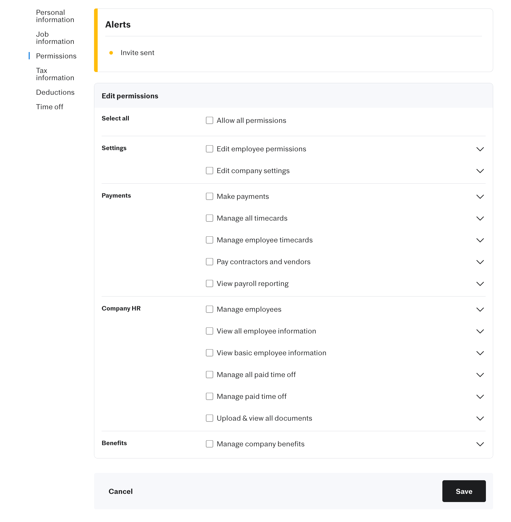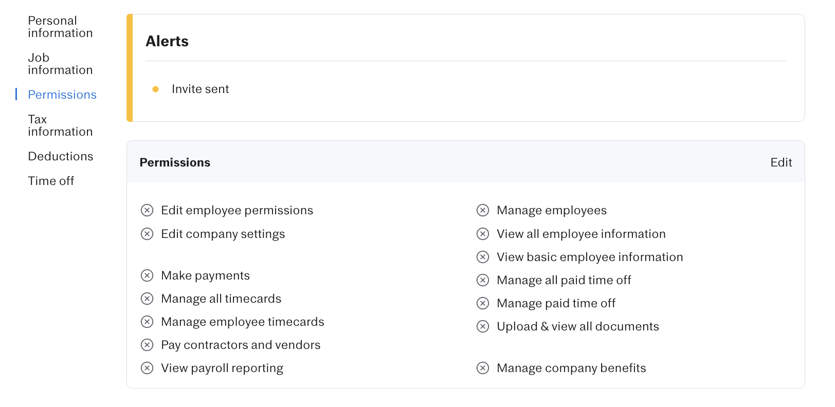 If a new member needs admin permissions, a current admin with Company Settings permissions will need to bring up the new member’s profile page in Justworks Payroll and click the 'Permissions' tab on the left side of the page.