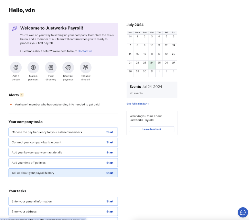 If you are at the start of the onboarding process, you will be able to click on the ‘Tell us about your payroll history’ task on your Justworks Payroll dashboard: