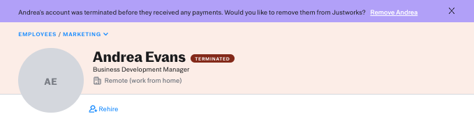 You can remove members from Justworks that have never been paid, and who are no longer employed. As long as the employee has never been paid, after an administrator has terminated them, an option will appear that will allow them to be removed, in a stripe across the top of their individual page, as well as in a link on the full list of all employees.