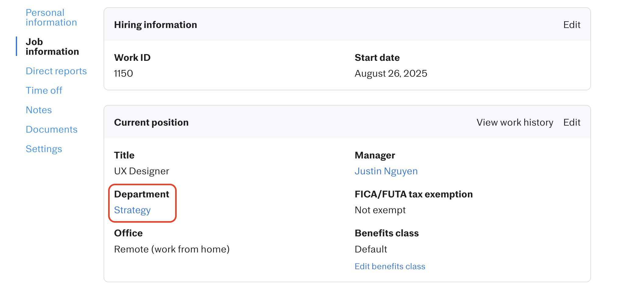 The Justworks directory makes it easy for members of your team to get each others’ phone and email contact information. The directory also shows job titles and reporting structure.