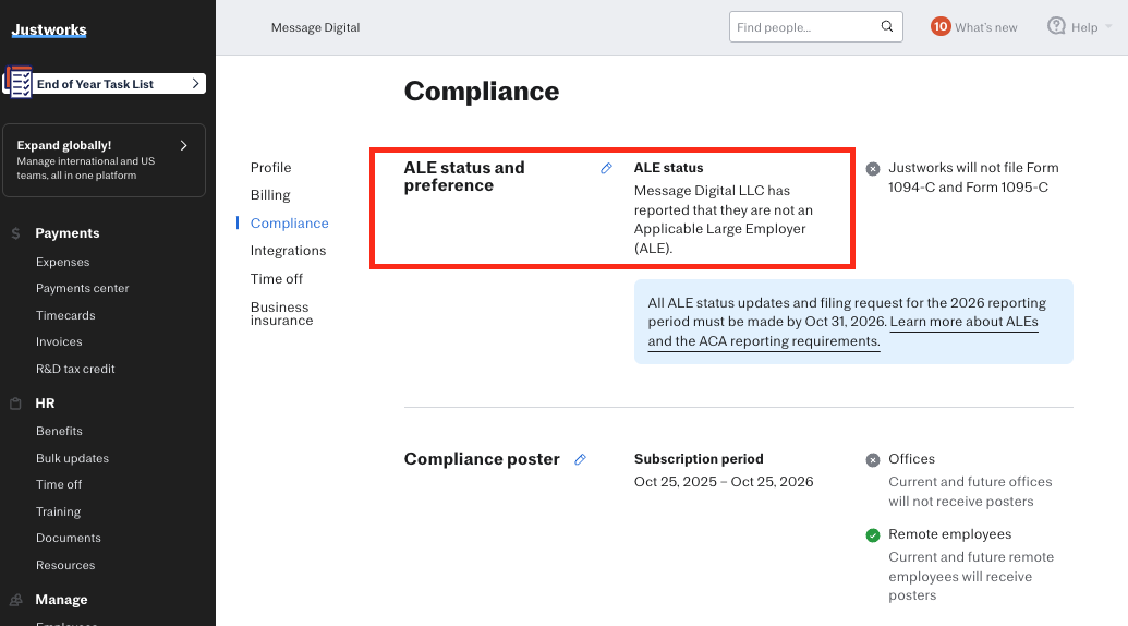 If you are an ALE, please let us know your status in your Company Settings, and we will file on your behalf. If you are an ALE and joined Justworks mid-year 2025, we will need to collect some additional 2025 health insurance information from you. If you aren’t sure whether your company is an ALE, you should check with your legal counsel.