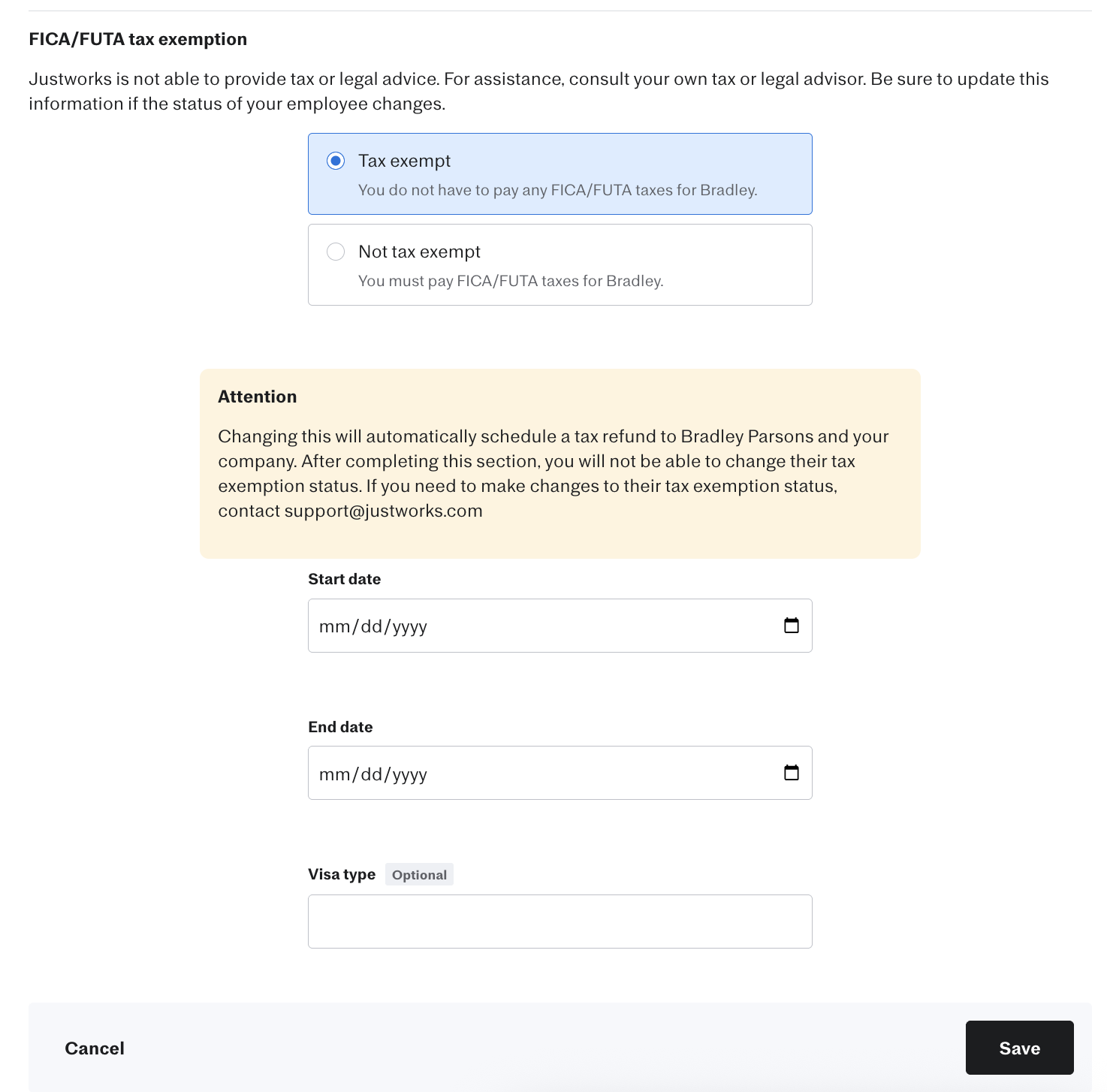 If you have employees who are on foreign visas that are exempt from FICA/FUTA taxes, you can mark them as such in Justworks.