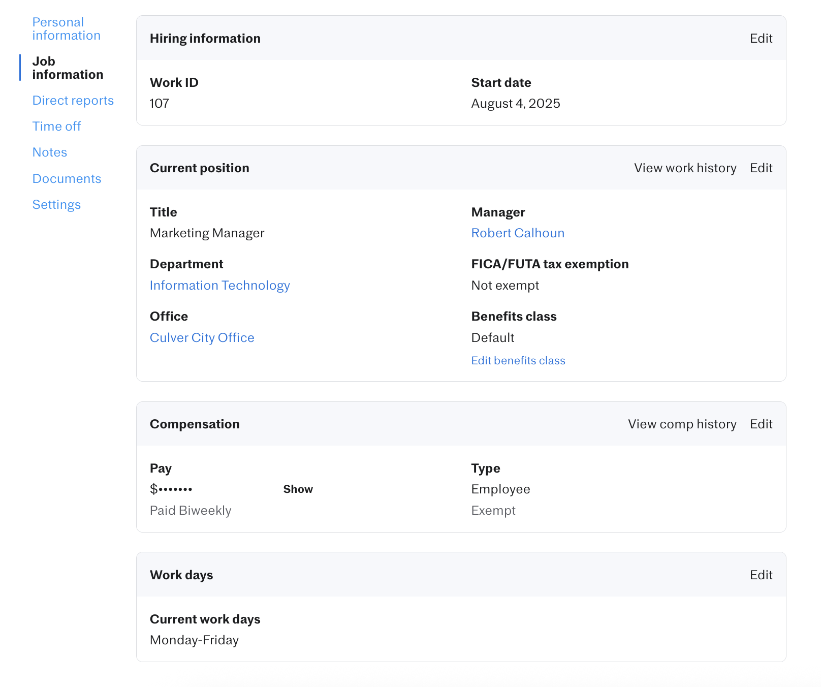 From their profile, you can navigate to the Job Information tab, and go to the ‘Current Position’ box. You’ll see if a FICA/FUTA status has been entered. To enter one, hit the ‘edit’ link towards the top right of that box.