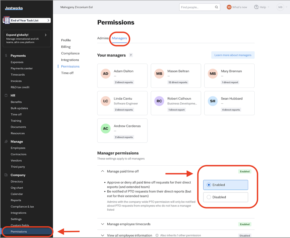 Manager permissions allow companies to give managers access to different functions across Justworks. As your company grows, you’ll want to give access to tools to help managers lead their teams and take some of that burden off of your admins. With manager permissions, you can enable what managers at your company can do.