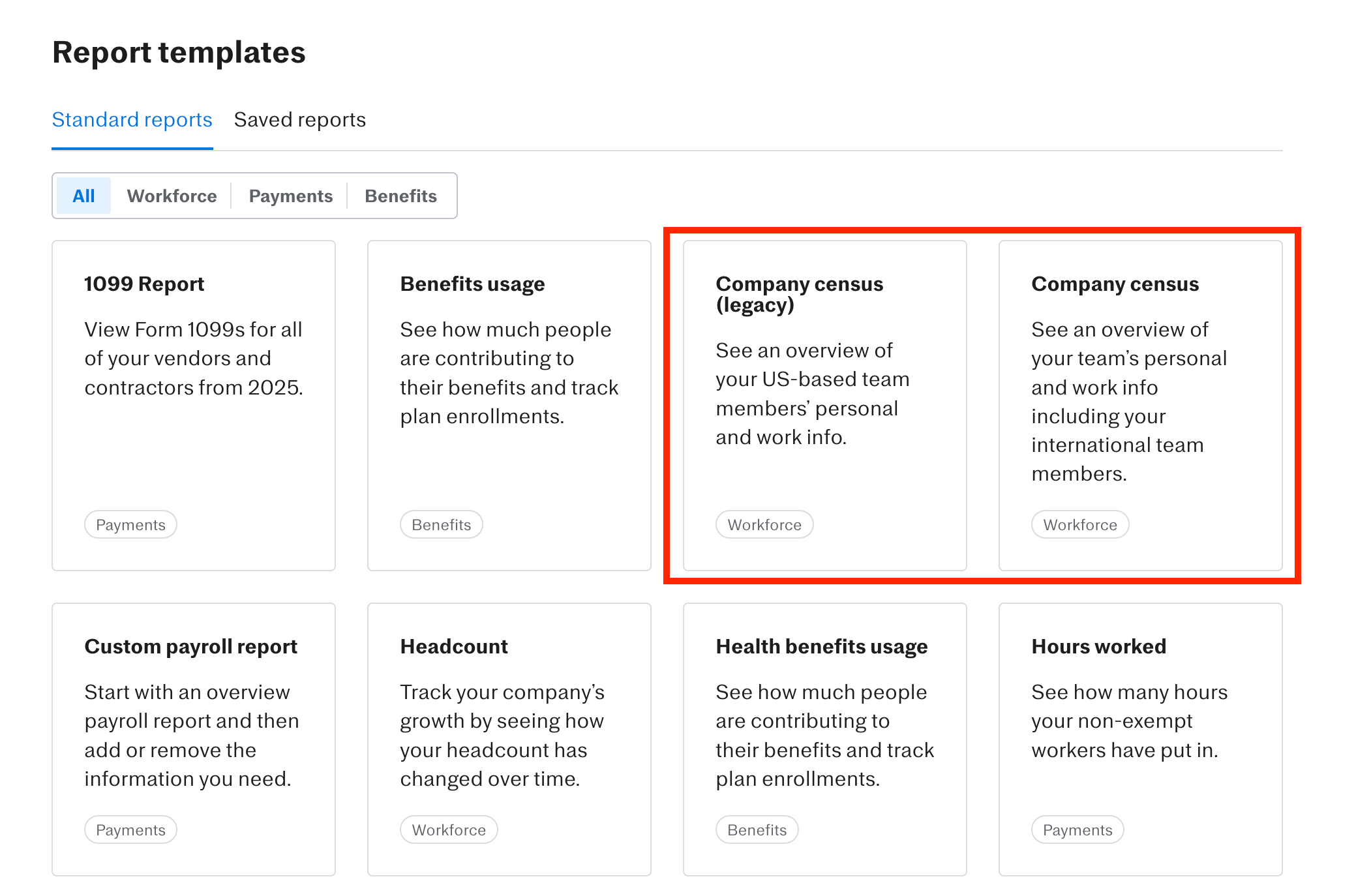 To access the report, log in to your Justworks account and navigate to Analytics in the left side menu. You'll see two 'Company Census' reports listed. The legacy report only shows U.S. based members whereas the other report shows U.S. and international members of your organization.
