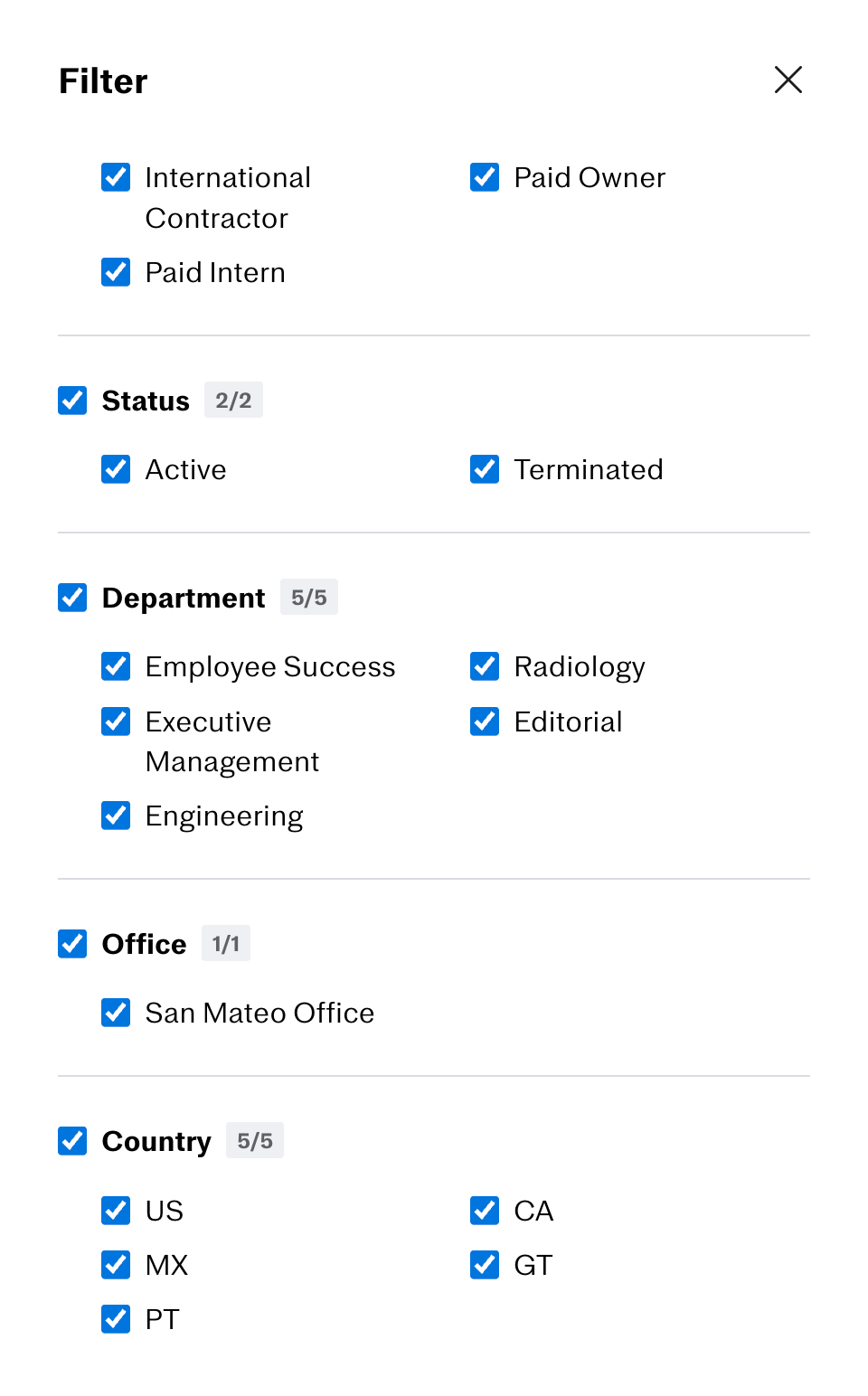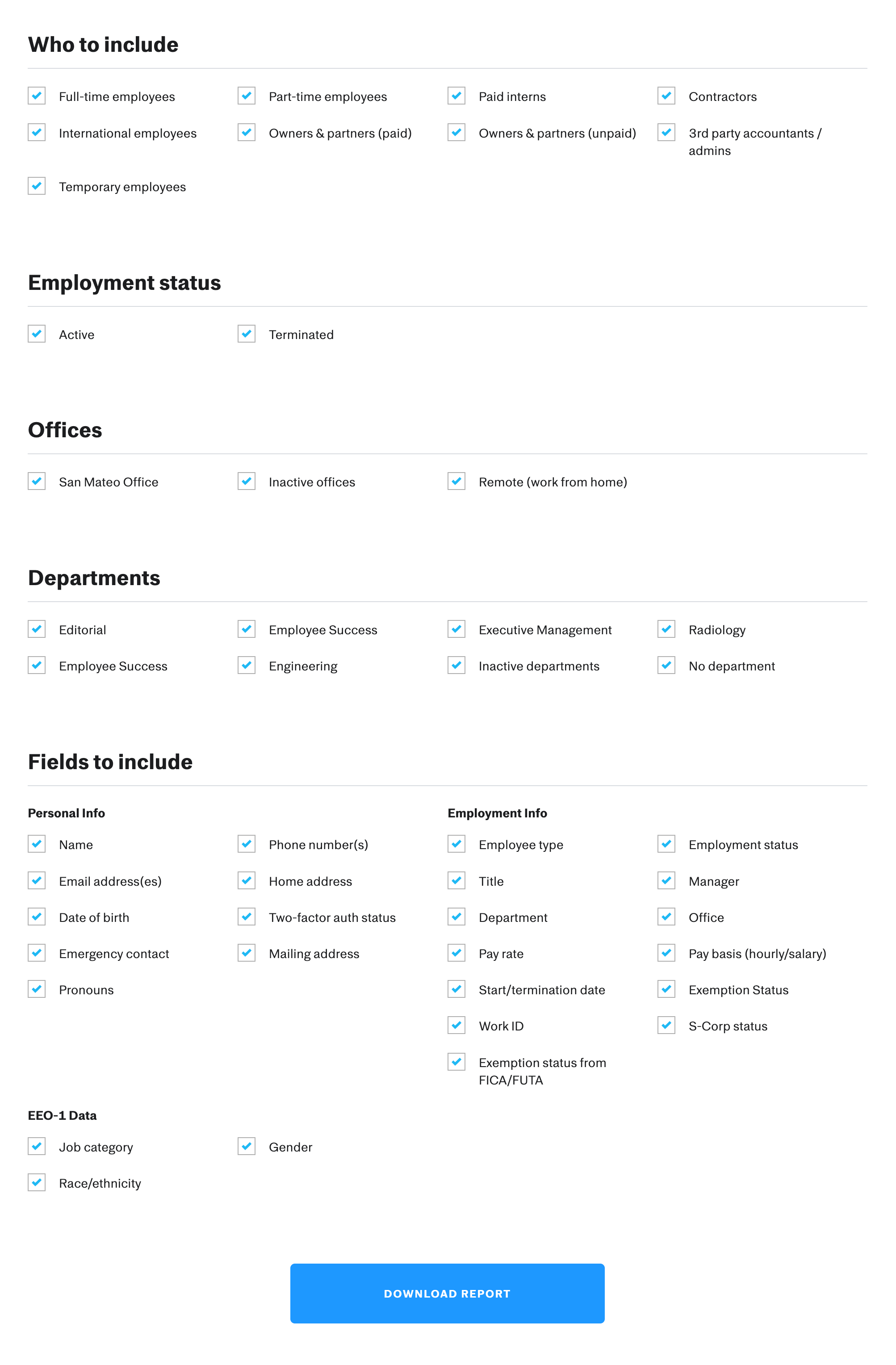 When you click into the 'Company census (legacy)' report, you'll be able to select and de-select who to include based on fields such as employment type, employment status, offices, and department.