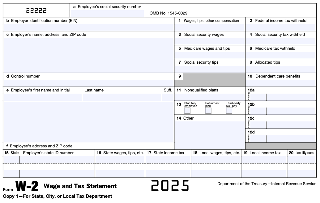 Form W-2 is an IRS tax form used to report wages, salary, and other compensation paid to employees, and the taxes withheld from them. A W-2 will be issued to any full or part-time employee that receives a payment through Justworks. It will state the total amount of income received as well as all federal, state, and local taxes withheld. Each box on your W-2 will contain information that can be identified in the below list. This is an example of what your Form W-2 will look like: