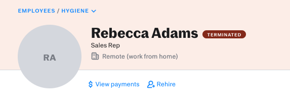 Once you’ve navigated to the former employee’s profile, you can click “Rehire” in the top right corner to begin the process.