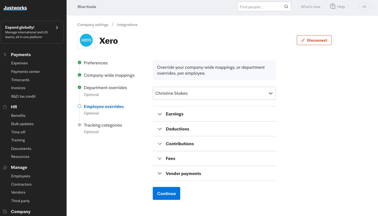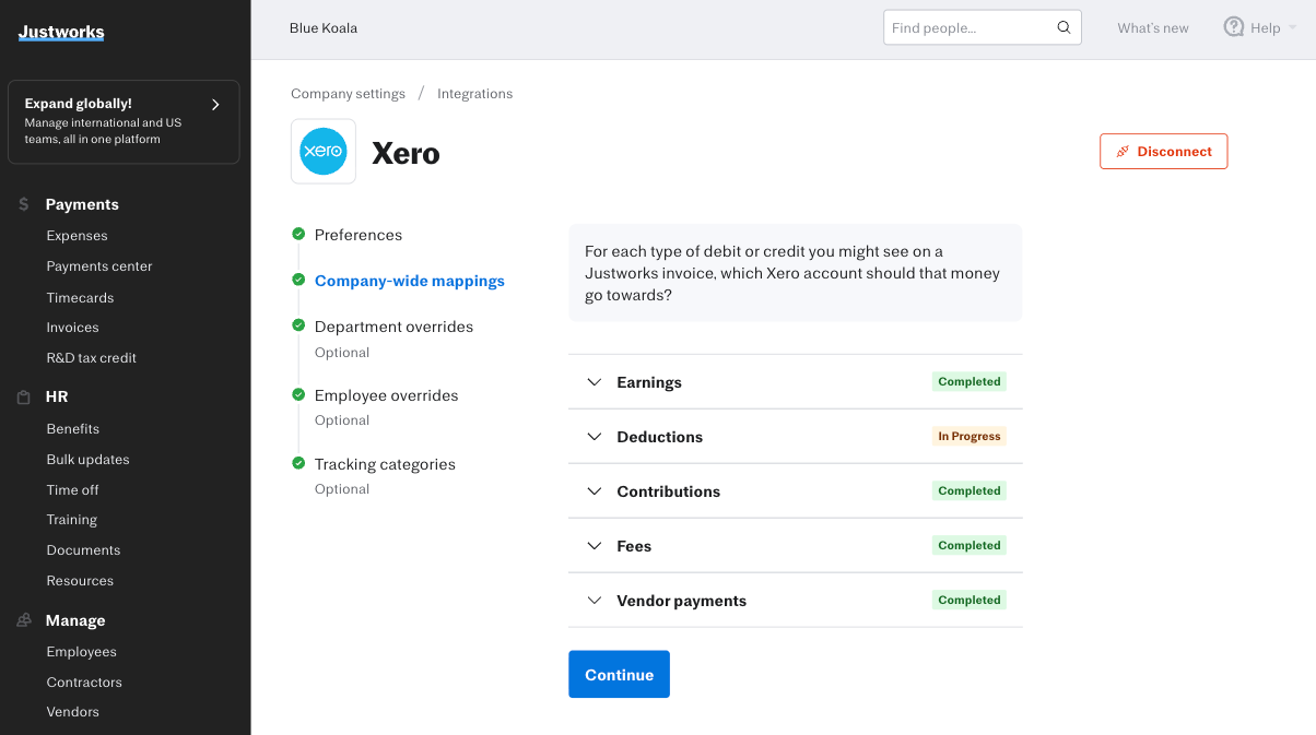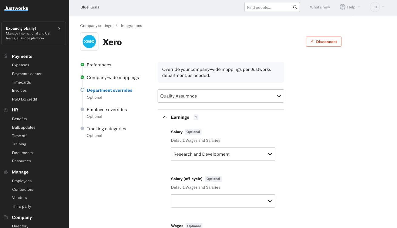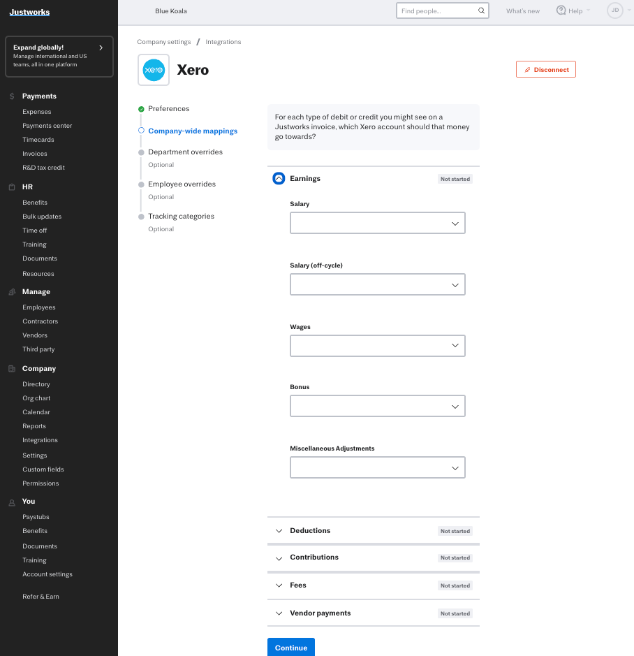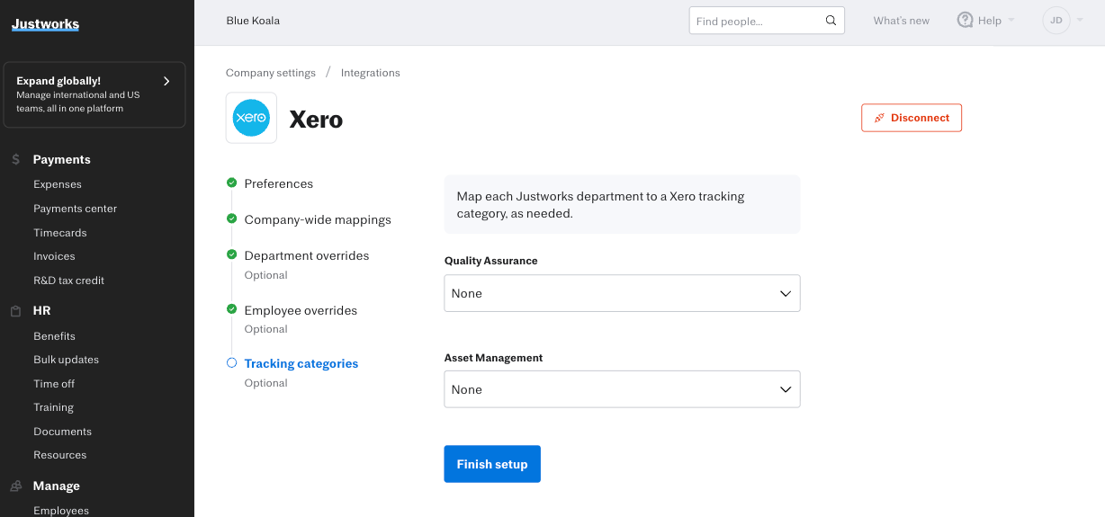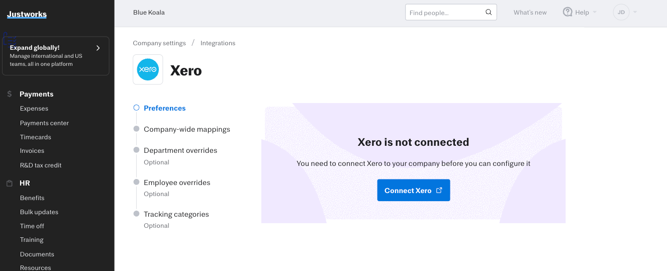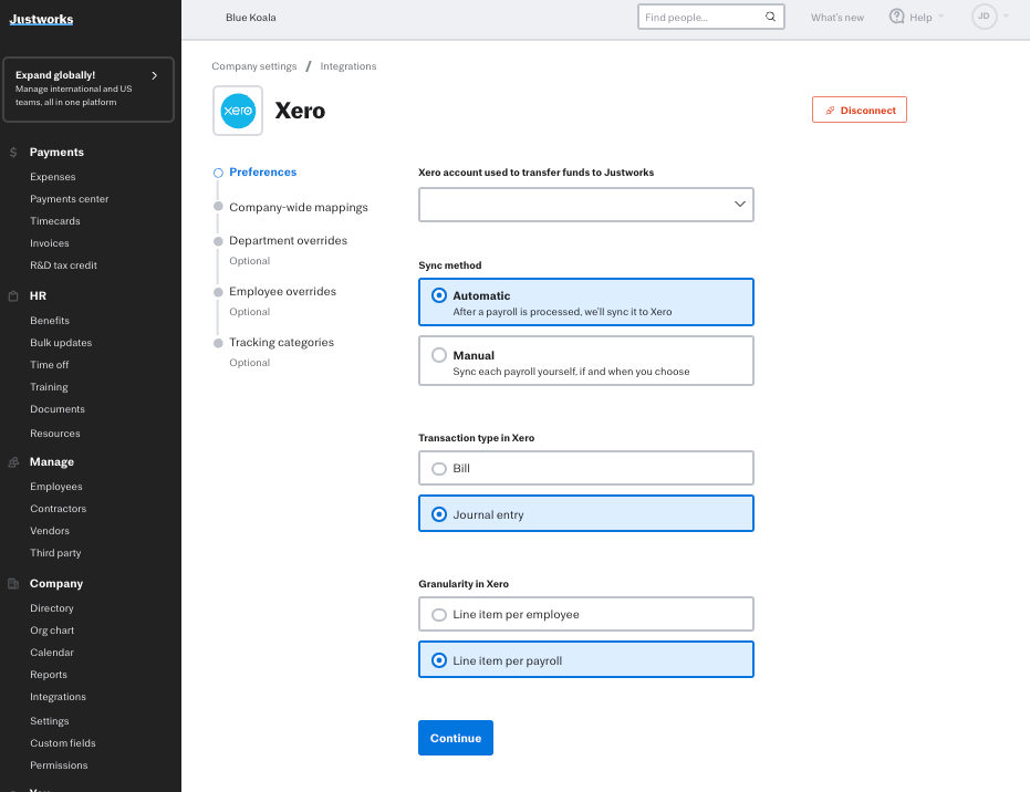 After connecting to Xero, you can decide how Justworks syncs data with your Xero account under Preferences.