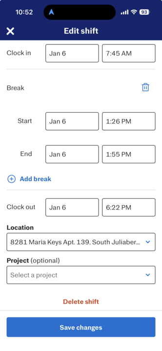 After tapping on the pencil icon you can edit shift details by selecting any of the available fields on the edit screen. You can edit the location, the start and end times and dates, breaks, and projects. You can also delete the shift entirely by clicking on delete at the bottom of the screen. Once you've made the necessary edits, select Save changes.
