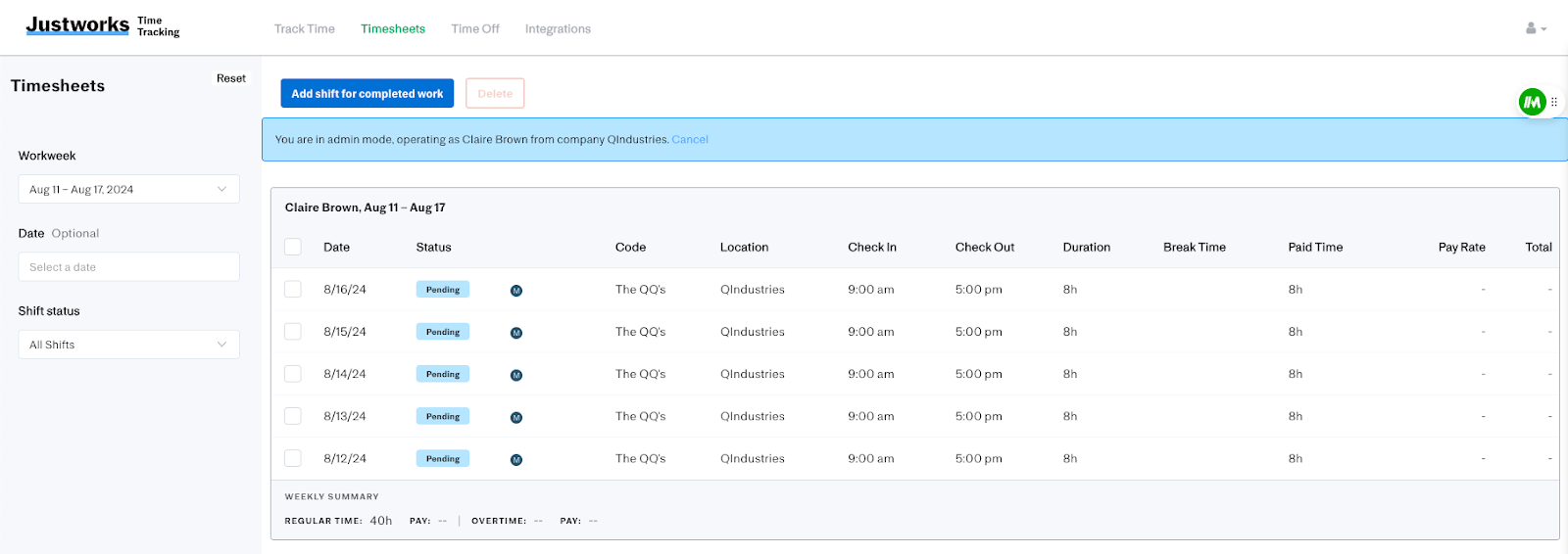 To edit shifts on the Justworks Time Tracking website, first navigate to the Timesheets tab. Then click on the shift you'd like to edit. Note that if the shift has the status of “Approved,” it cannot be edited. If it is approved, it can be edited by your manager or unapproved for you to edit yourself.