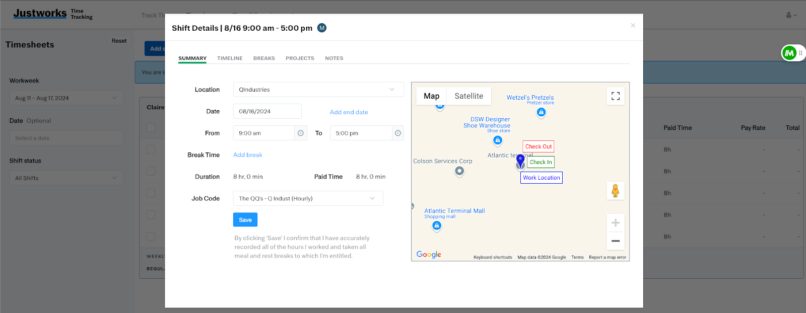 Once you've clicked on the shift you'd like to edit, the shift details window will appear. In this window, you can edit the location, date, start and end time, break time, and project information for your shift. If these fields are not editable, there are two possible reasons First, you do not have permission to edit your time entries. Second, you are attempting to edit a shift that has already been approved. If this is the case, your manager or supervisor can either edit the shift directly or un-approve it so you can edit it yourself.