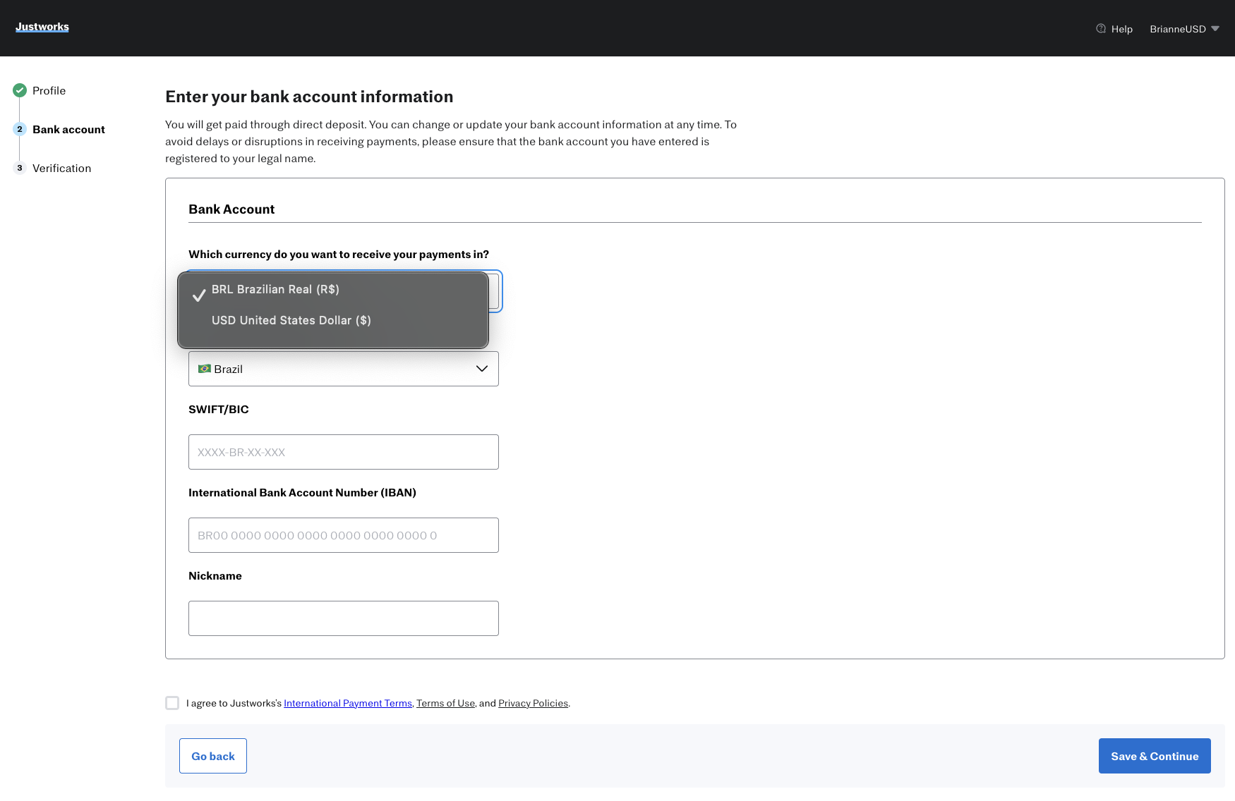 Once an international contractor receives an invitation to onboard to the Justworks platform, they will be asked to create their profile and then prompted to enter their bank account information. They will then be given the option to either select to receive payments in their local currency (based on their country of residence) or USD (United States Dollar).