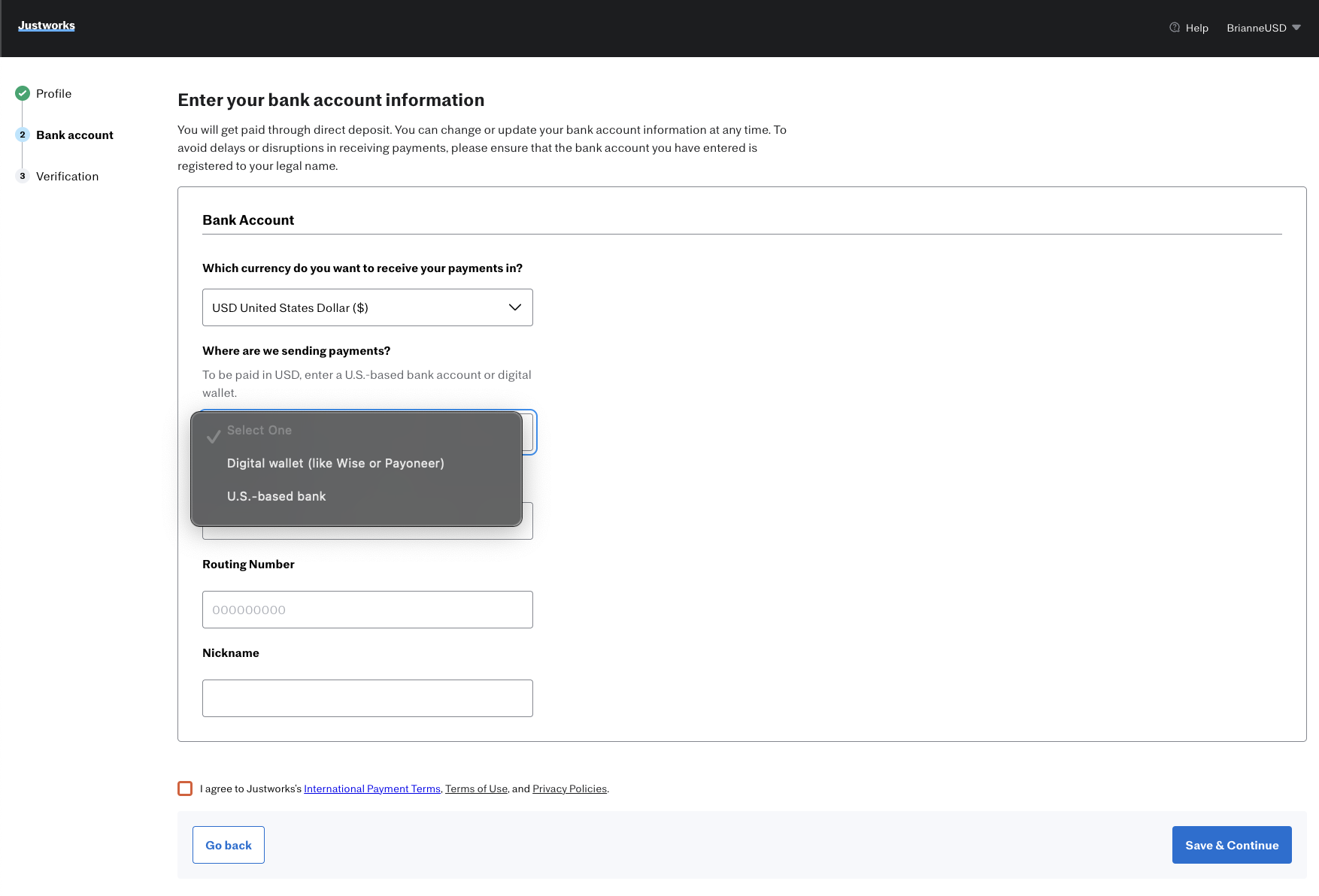 If they select to be paid in USD, they will then be promoted to select how they want to receive payments - either to a Digital wallet (like Wise) or to a U.S.-based bank. They will need to enter in the respective U.S.-based account number and routing number. They then need to select that they agree to Justworks’ International Payment Terms, and then select Save & Continue, and complete the onboarding process by verifying their identity.