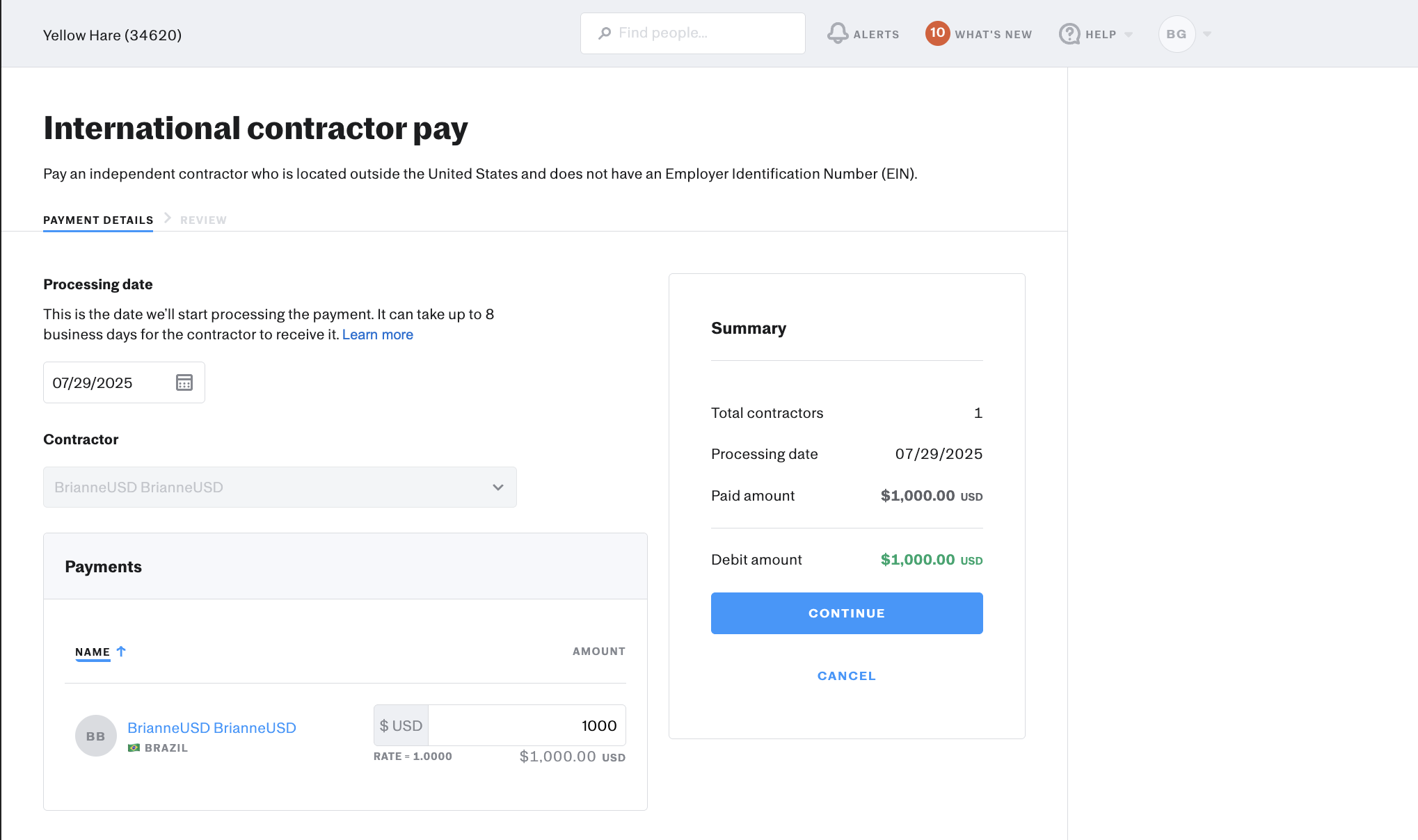 Payments made to international contractors that have selected to be paid in USD will show a currency rate of 1.000. USD payments will populate on the right-hand side of the screen - admins need to then select Continue.