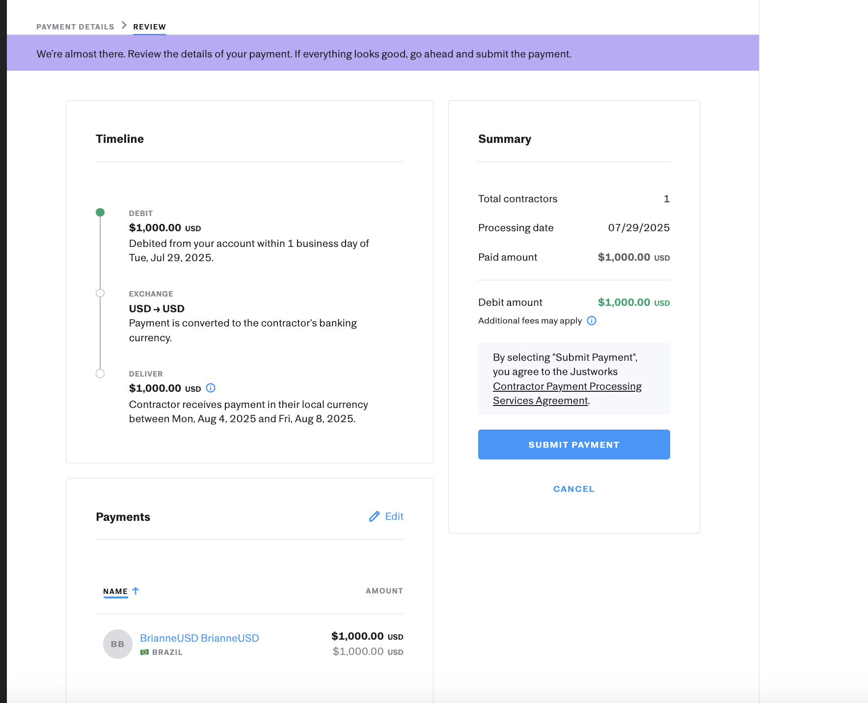 The admin can then review payment details in USD and then select Submit Payment.