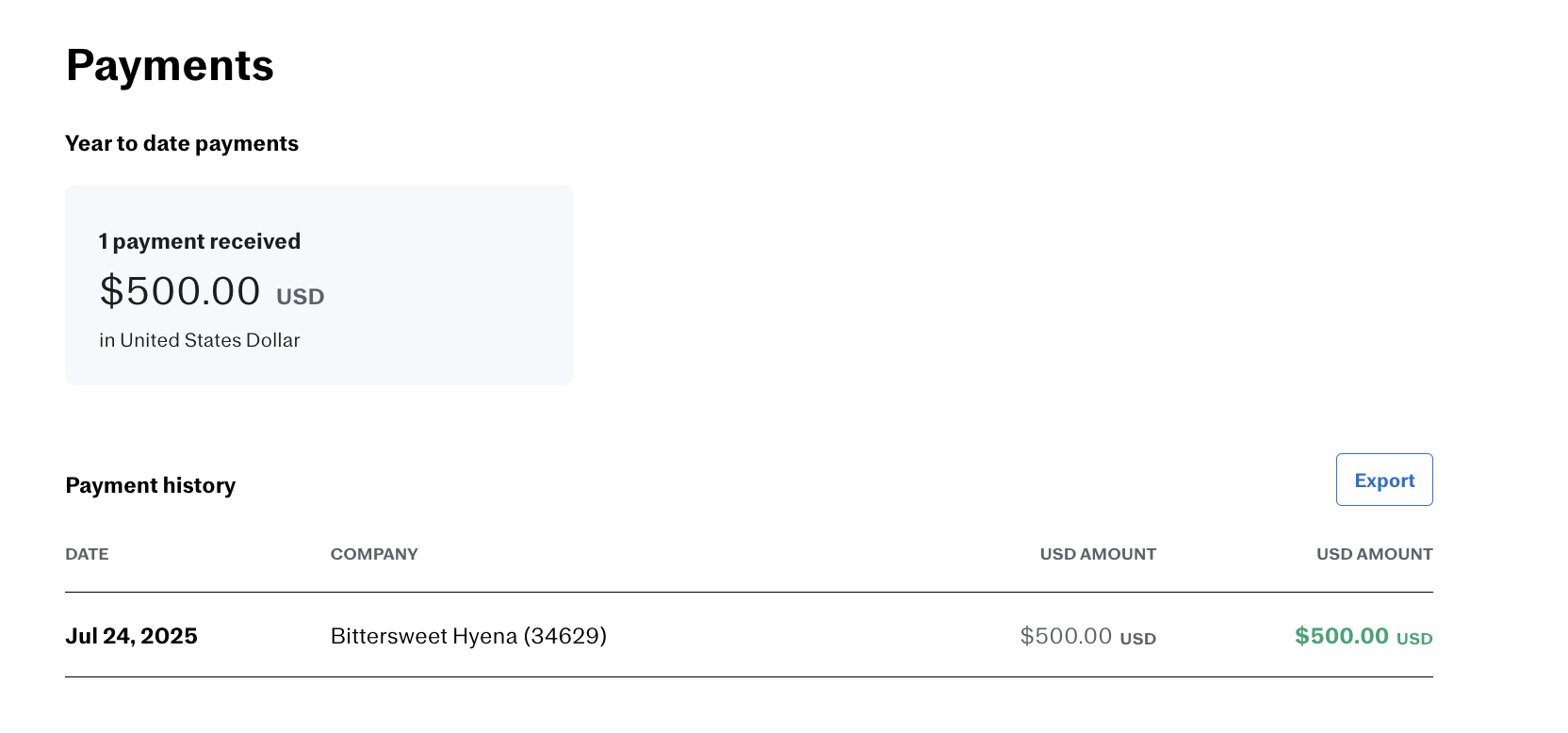 International contractors can then view their payments in USD. *If the contractor has multiple payments in both their local currency and USD, both types of payments would be listed.