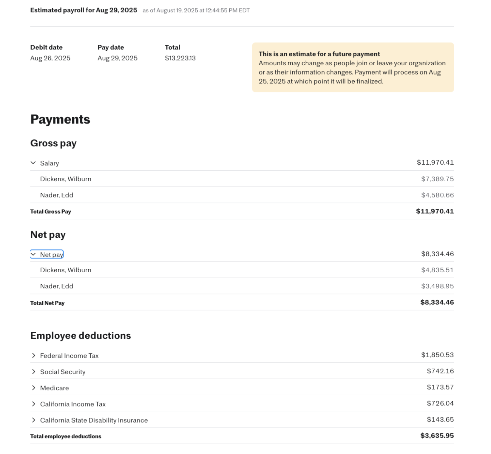 From there, you can expand the dropdown arrows next to each line item to view per-employee details, including net pay, taxes, and employer contributions.