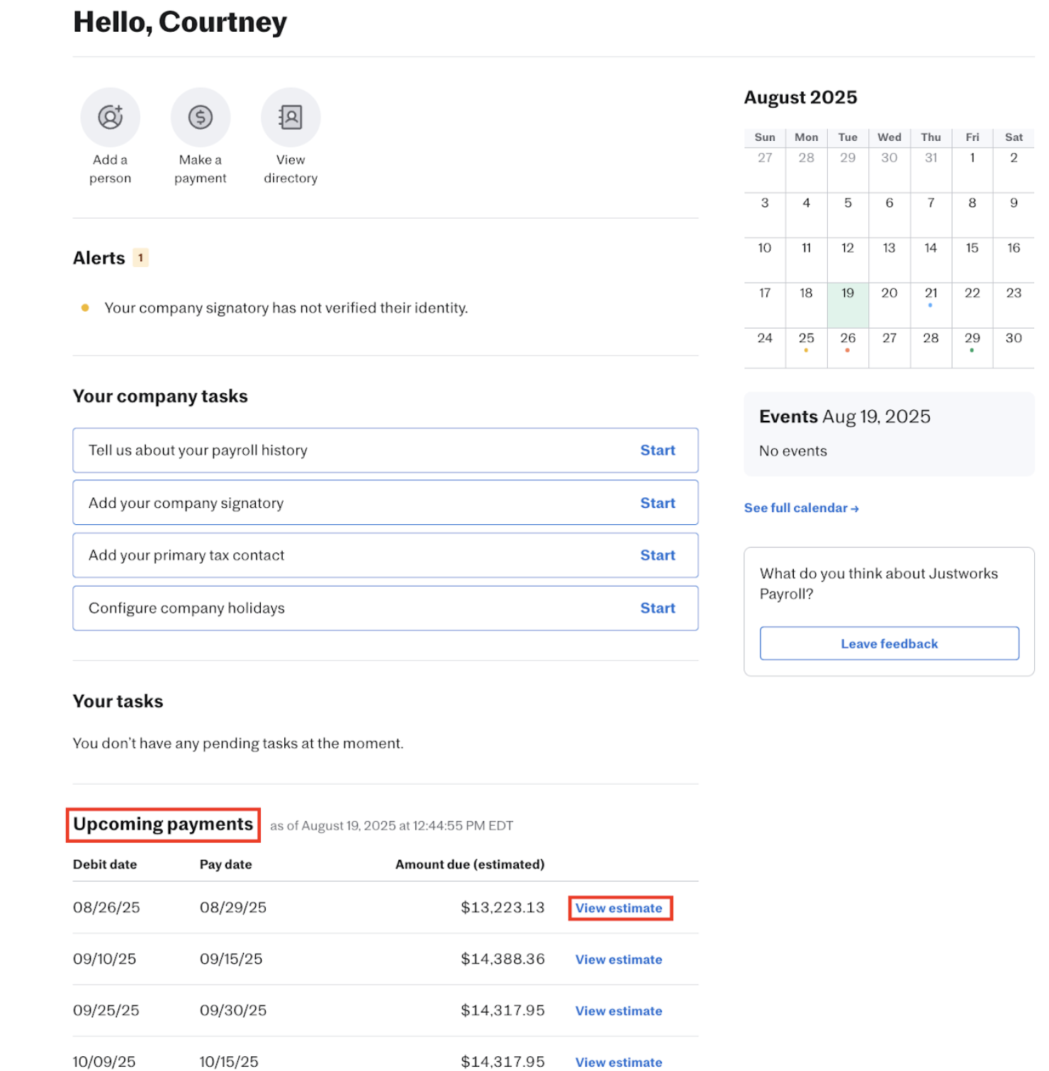 To view a detailed breakdown of a payroll, simply click the View Estimate button located under the Upcoming Payments section on your dashboard.