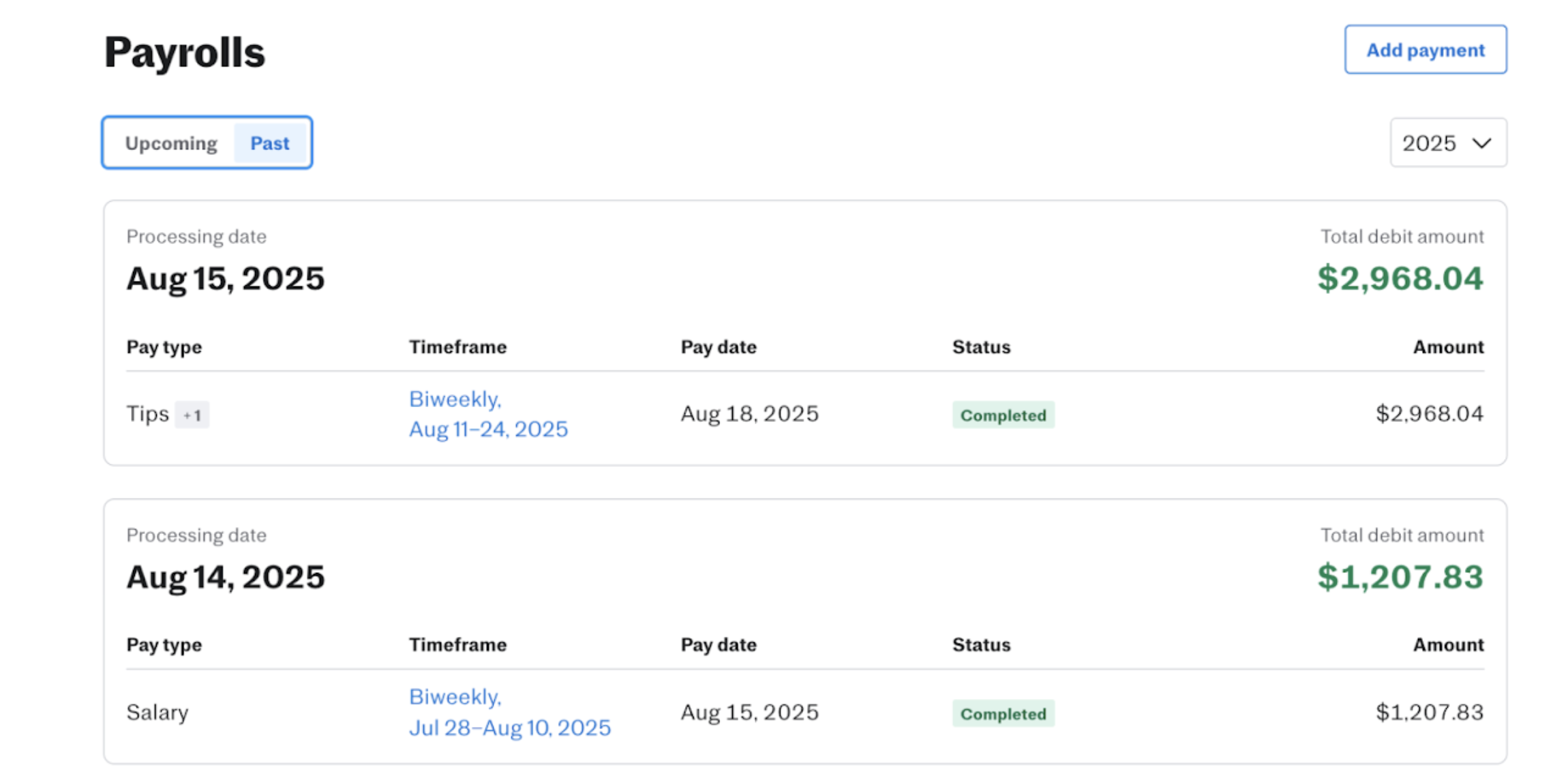 Note: Justworks Payroll collects your company’s payroll in two separate debits: one for net employee payments and one for the associated employee and employer taxes. Together, these two debits will match the total amount listed under the Upcoming Payments section.