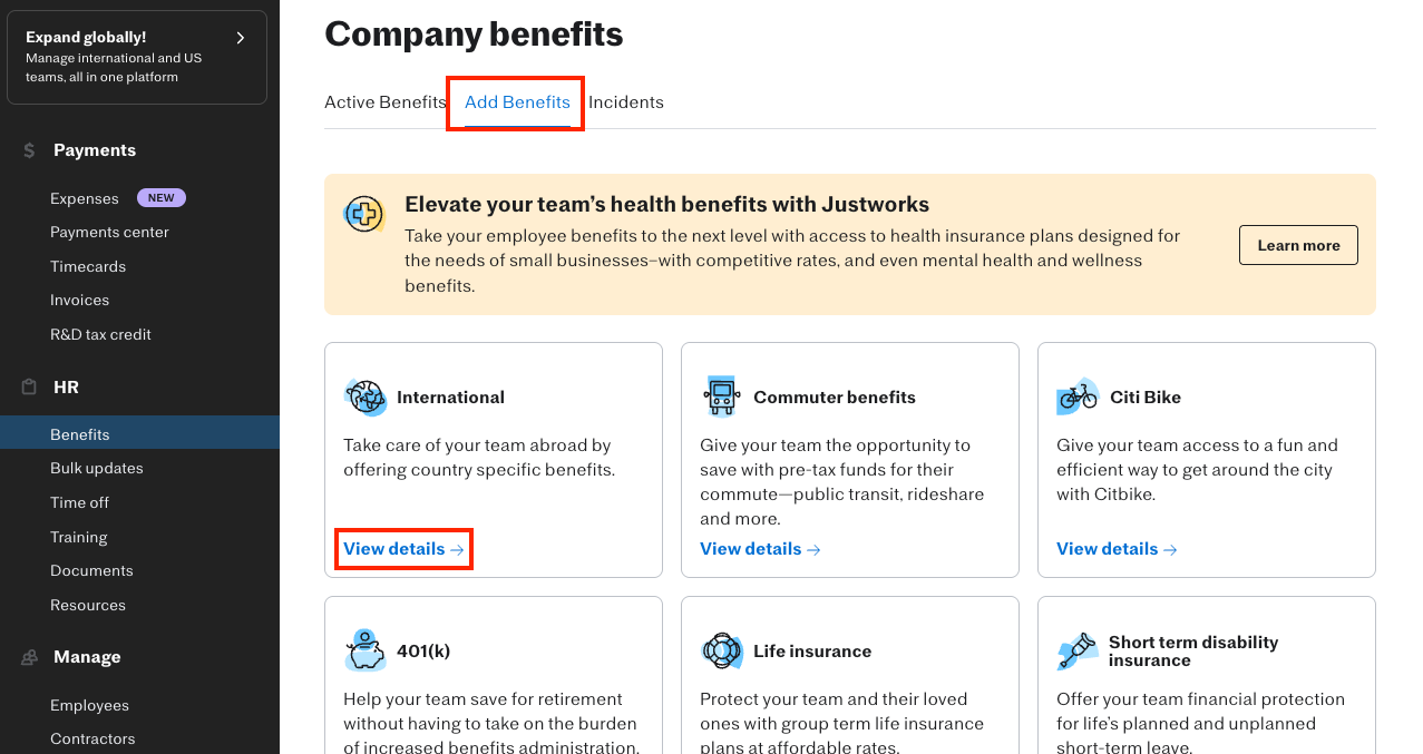 Justworks interface showing the Company benefits section. Specifically showing when the Add Benefits tab is selected and how to View details for International benefits.