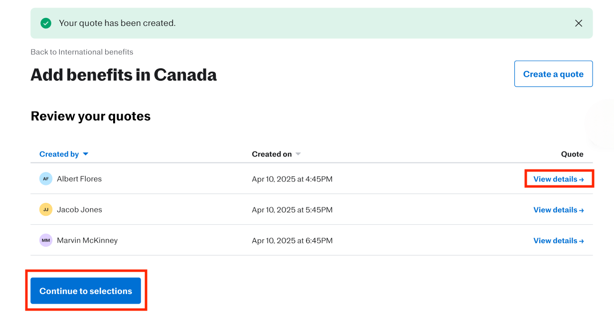 Justworks interface showing the Add benefits in Canada section after a quote is submitted. Specifically showing how to View details or Continue to Selections from this page.