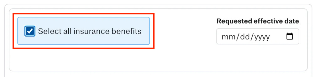 Each benefit is presented in an individual card. Click “Select Benefit” on each applicable card to add it to your package. You can also specify a Requested effective date based on employee hire dates. These dates are used as guidance and are not guaranteed. Effective dates cannot be in the past and must be set for a future date.