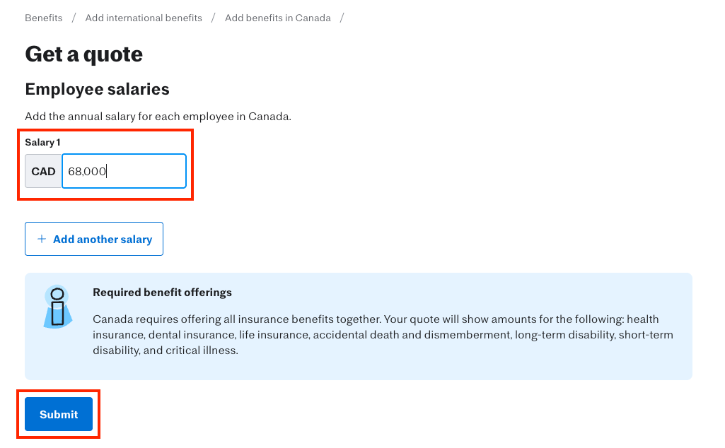 To get a quote, enter the employee’s salary in their local currency in the “Salary 1” field. For this example, we’re using “68,000.00 CAD” as shown below.