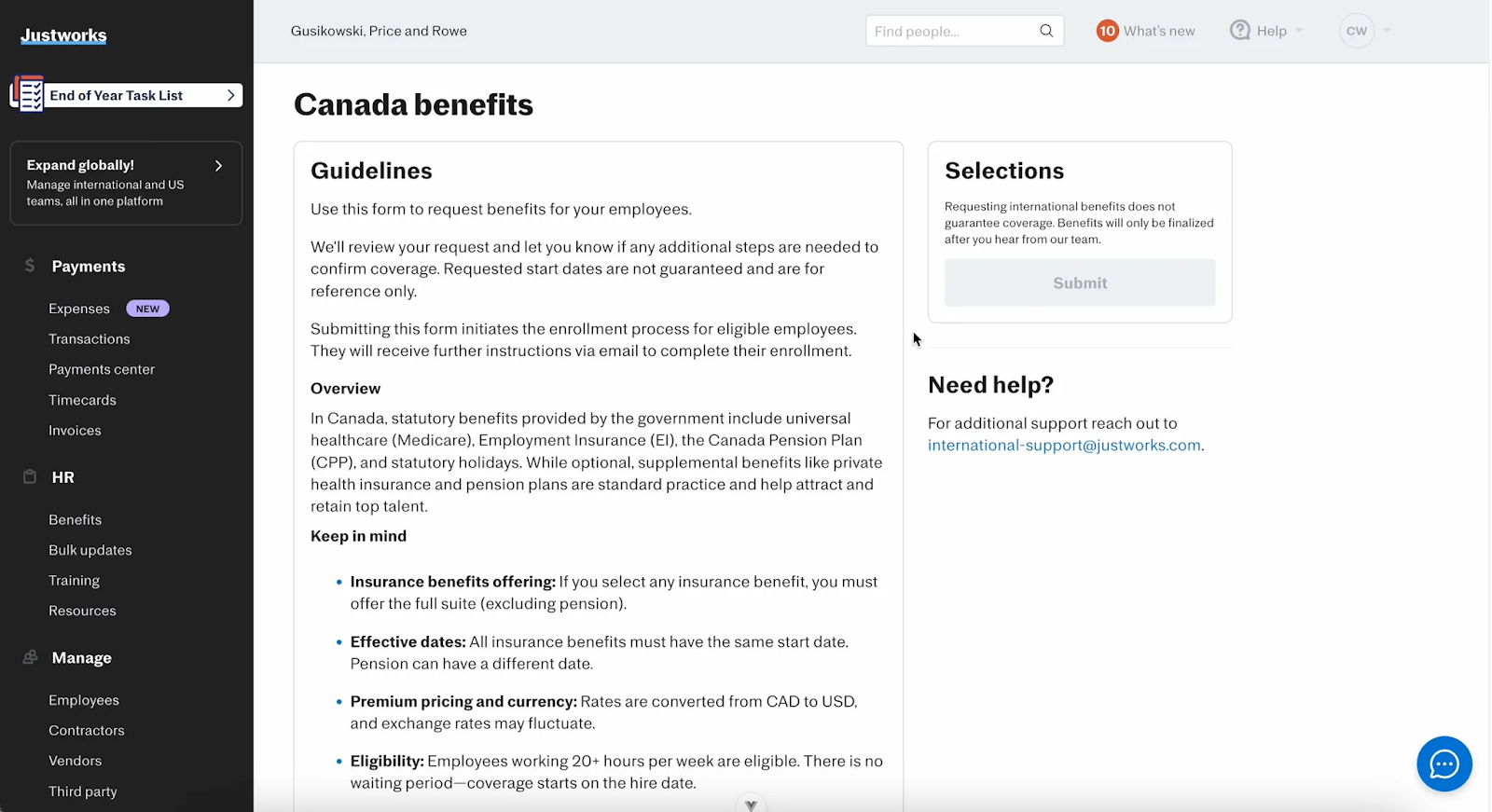 Admins supporting full-time employees in Canada using Justworks Employer of Record (EOR) can quote and request supplemental benefits directly in the Justworks platform.