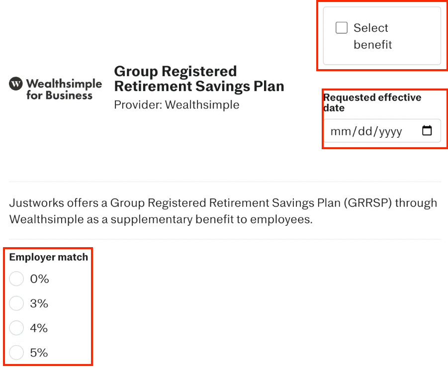 Justworks interface showing the Canada benefits selection form. Specifically how to Select benefit, Request effective date, and select Employer match.