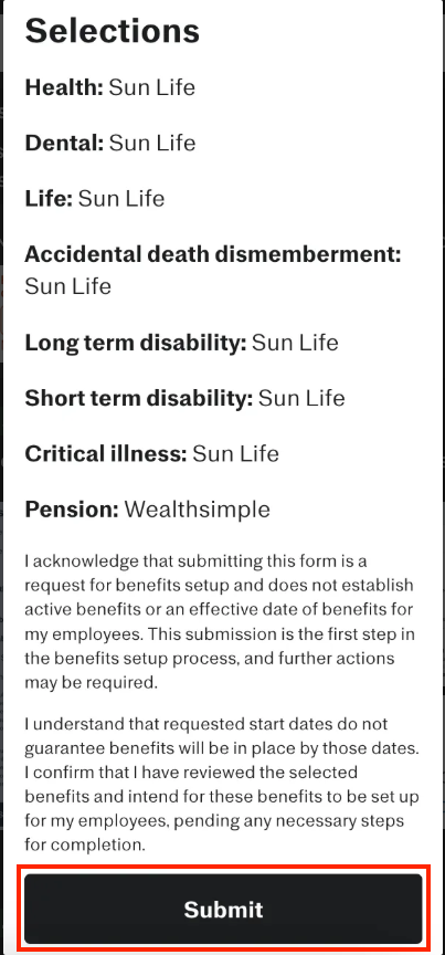 Justworks interface showing the review page of the Canada benefits selection form and specifying how to Submit the selections.