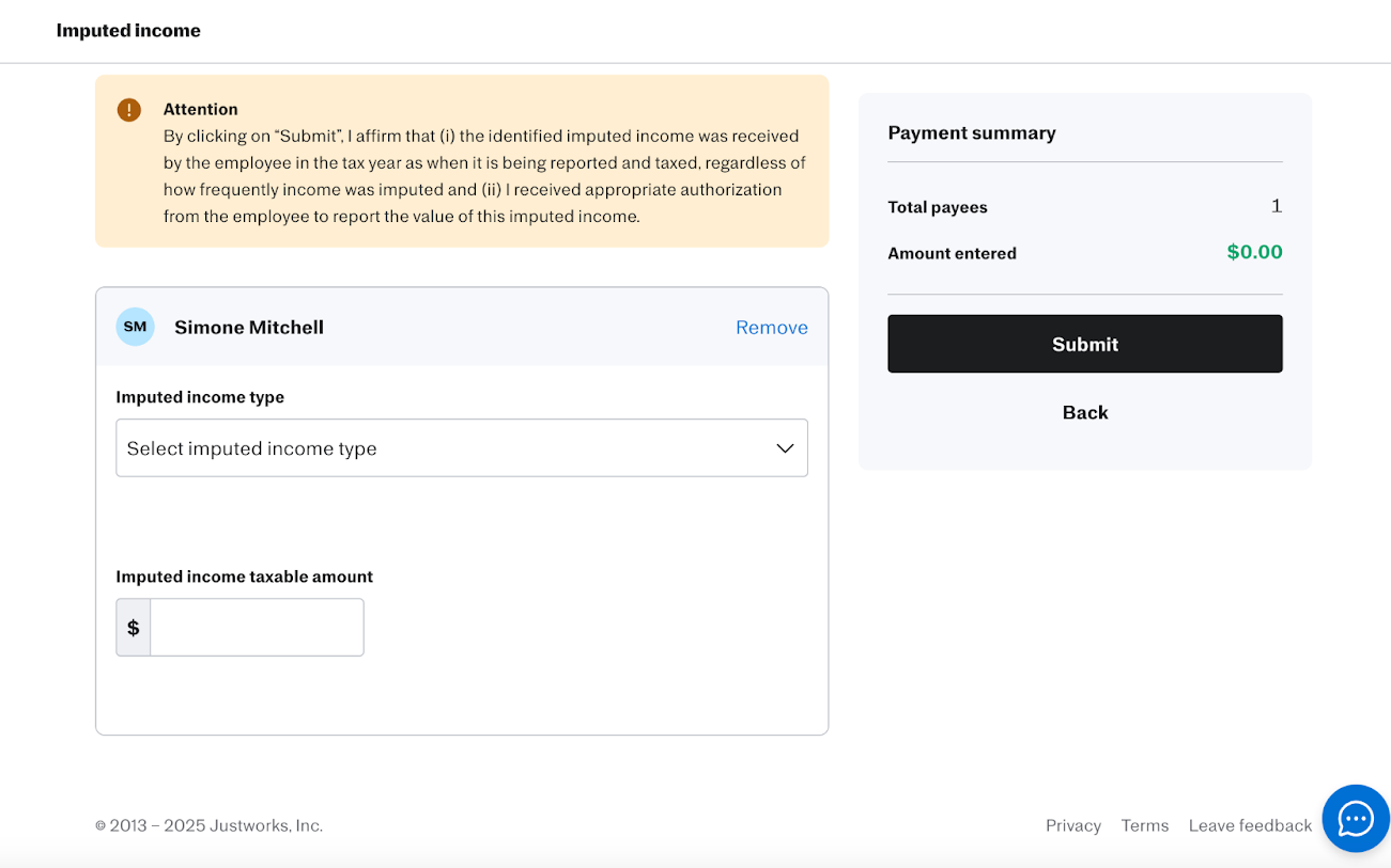 Once you’ve selected a label, you’ll be able to enter the total taxable amount of imputed income.