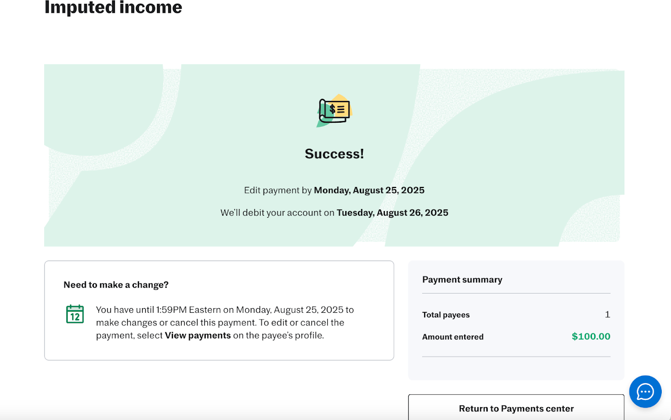 Screenshot showing the 'Success!' page that appears after imputed income has been submitted.