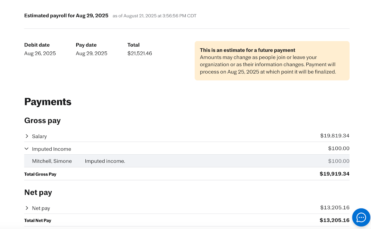 Screenshot showing an upcoming payroll estimate that includes imputed income for an employee.