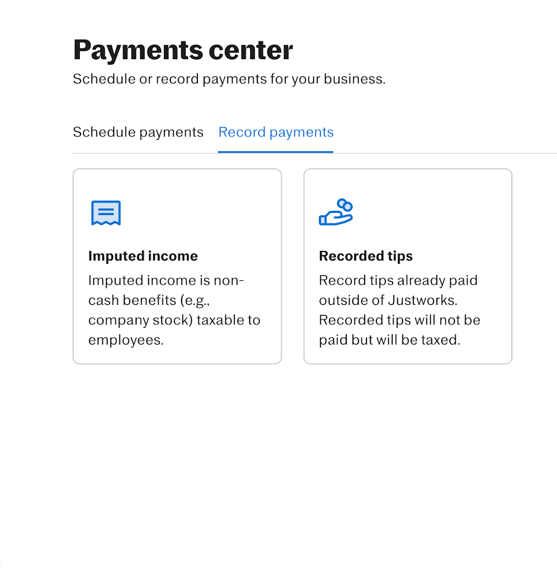 Admins with ‘Make payments’ permissions can record imputed income in Justworks Payroll to ensure the applicable taxes are collected from the employee and included on their tax forms. Recording imputed income for an employee does not initiate a payment to them, instead, we apply the imputed income to the employee’s next paycheck and withhold the corresponding employee and employer taxes as a result of the additional income reported for the employee.