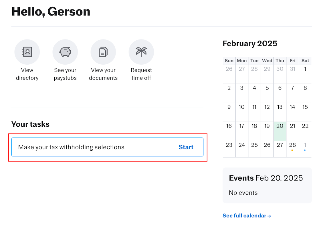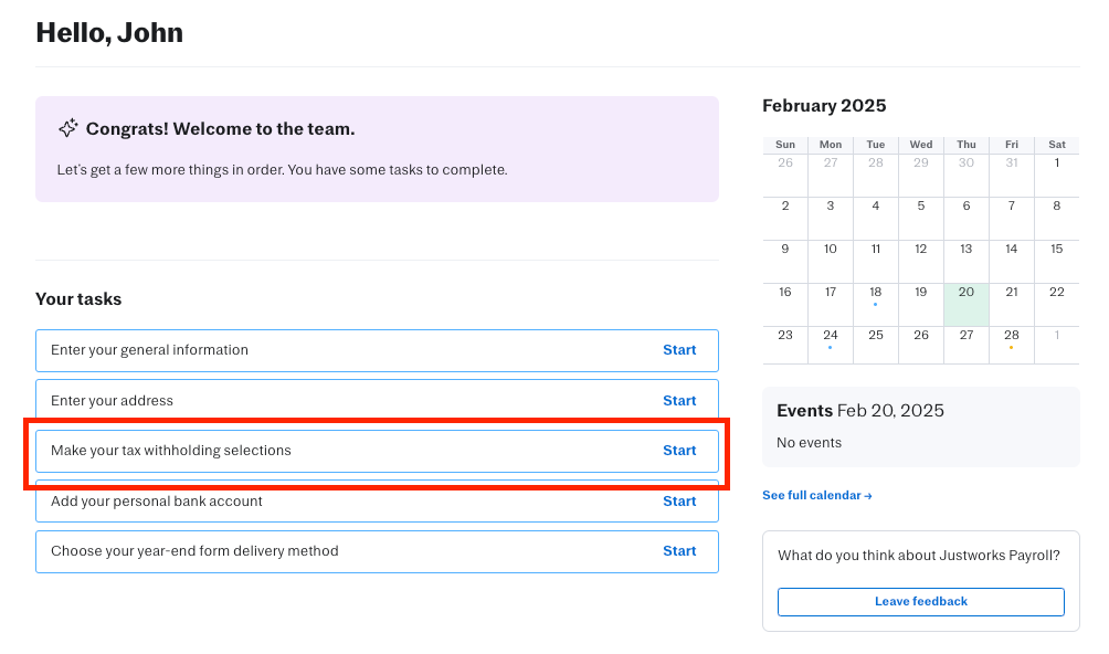 During their initial account setup, employees are prompted to enter their federal, state, and local tax information through the ‘Make your tax withholding selections’ task listed under the Your tasks section of their Justworks Payroll dashboard.