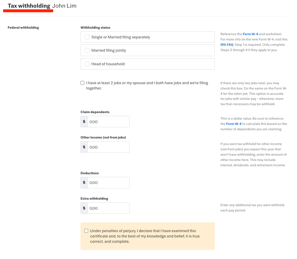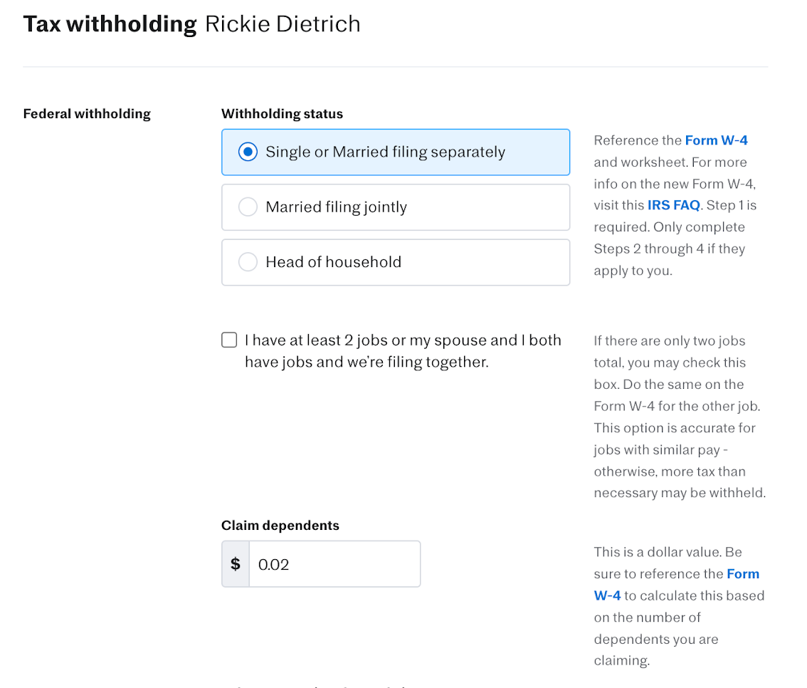 The first details an employee will be prompted to enter are their federal withholding settings. This information would be based on the most current version of the Form W-4. Employees can ensure that the information they enter is correct by consulting the Form W-4 instructions.