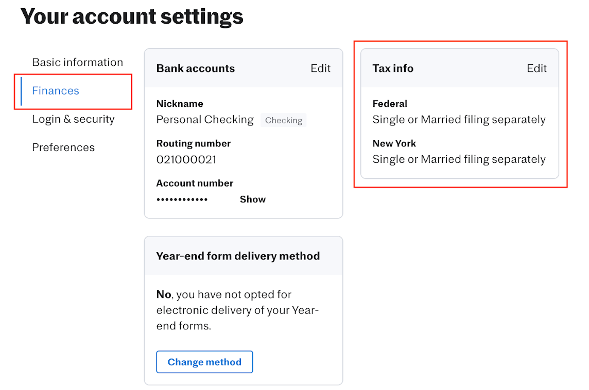 If an employee ever needs to update their tax information, they can make changes by navigating to the ‘Account Settings’ or 'Profile' tab of their Justworks Payroll account. From there, they can click on the ‘Finances’ tab on the left side of the page.